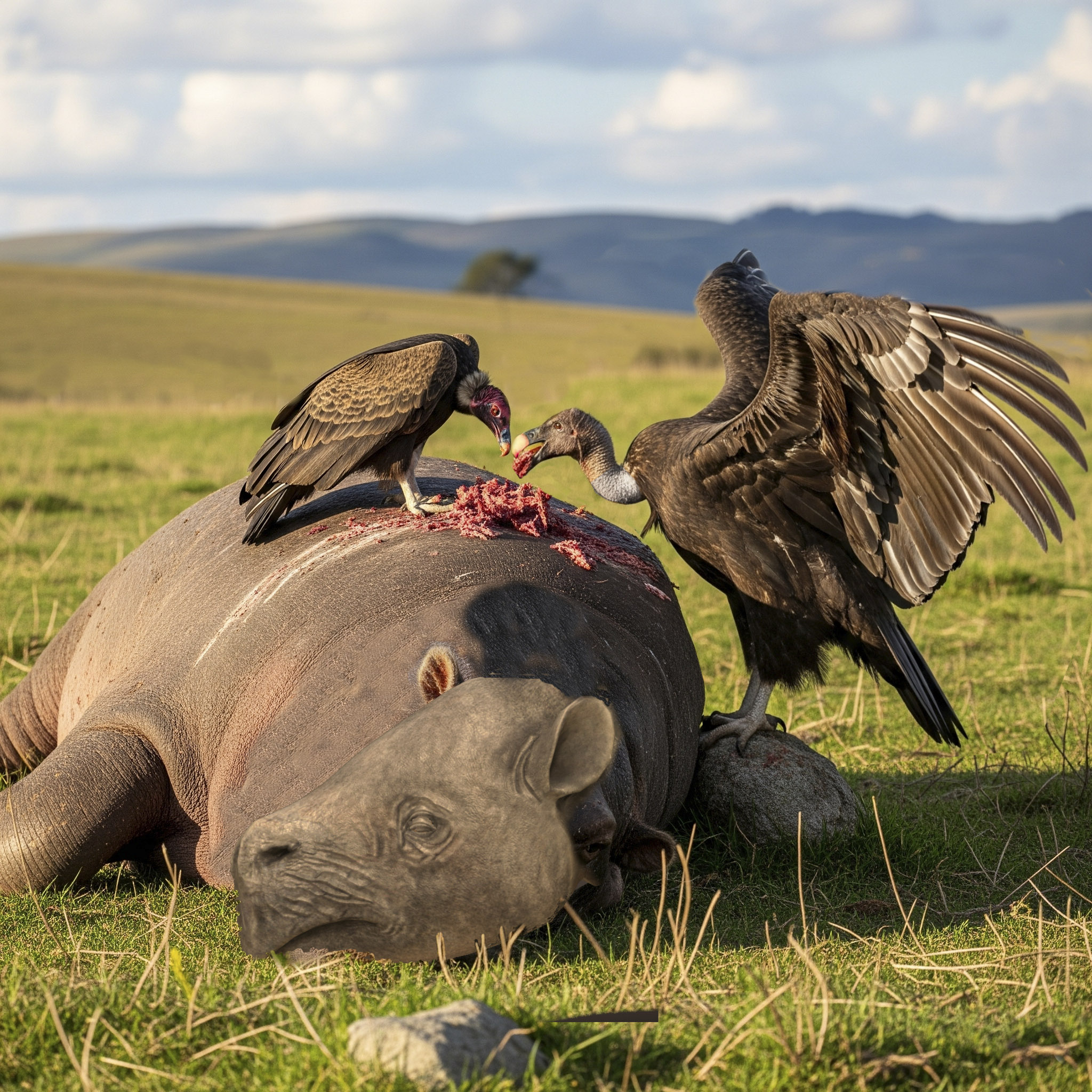 Un inmenso buitre del trueno carroñea a un toxodonte junto a un buitre de cabeza roja. Recreación especulativa que mezcla fotomontaje e IA.