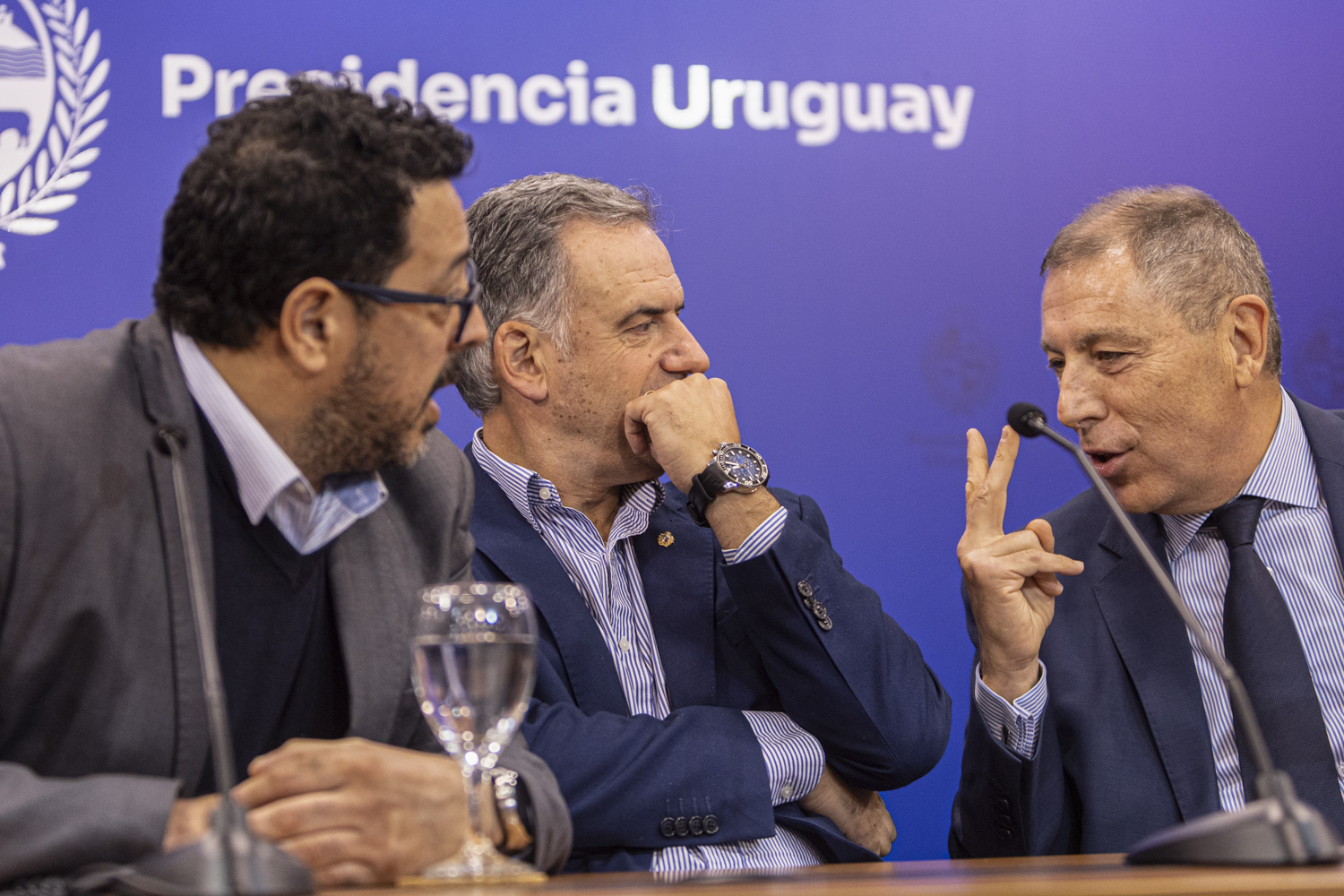 Alejandro Sánchez, Yamandú Orsi y Gabriel Oddone, en Torre Ejecutiva (archivo, mayo de 2025).