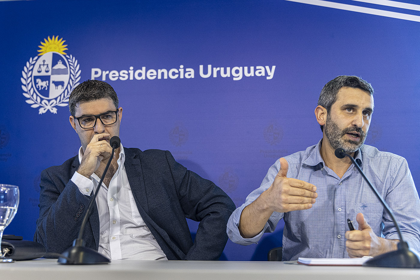 Mariano Tucci y Daniel Caggiani, luego de la reunión de los legisladores del Frente Amplio con el presidente Yamandú Orsi en la residencia de Suárez y Reyes, el 31 de marzo.