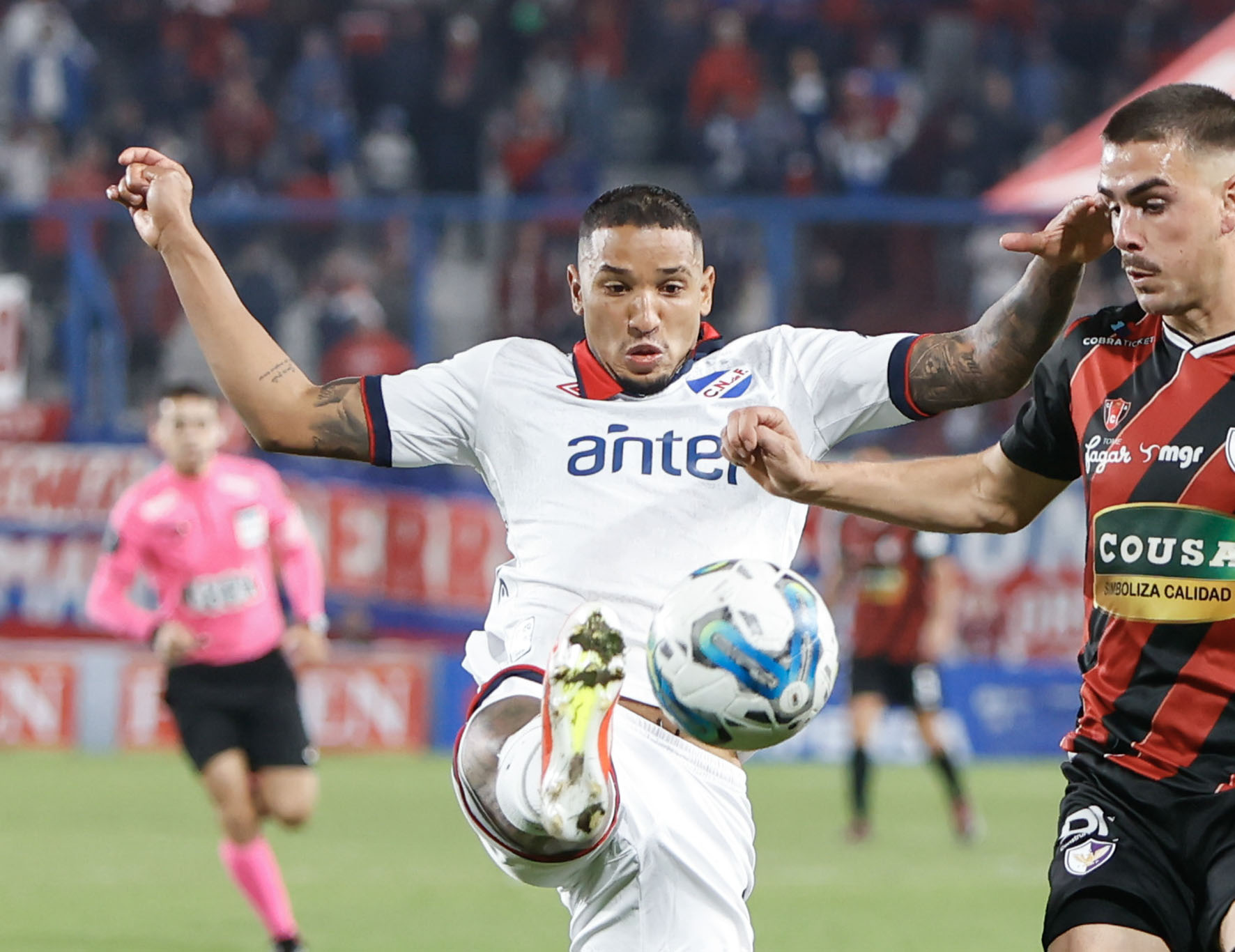 Juan Izquierdo, de Nacional, y Maximiliano Juambeltz, de Fénix, el 10 de mayo de 2024 en el estadio Centenario.