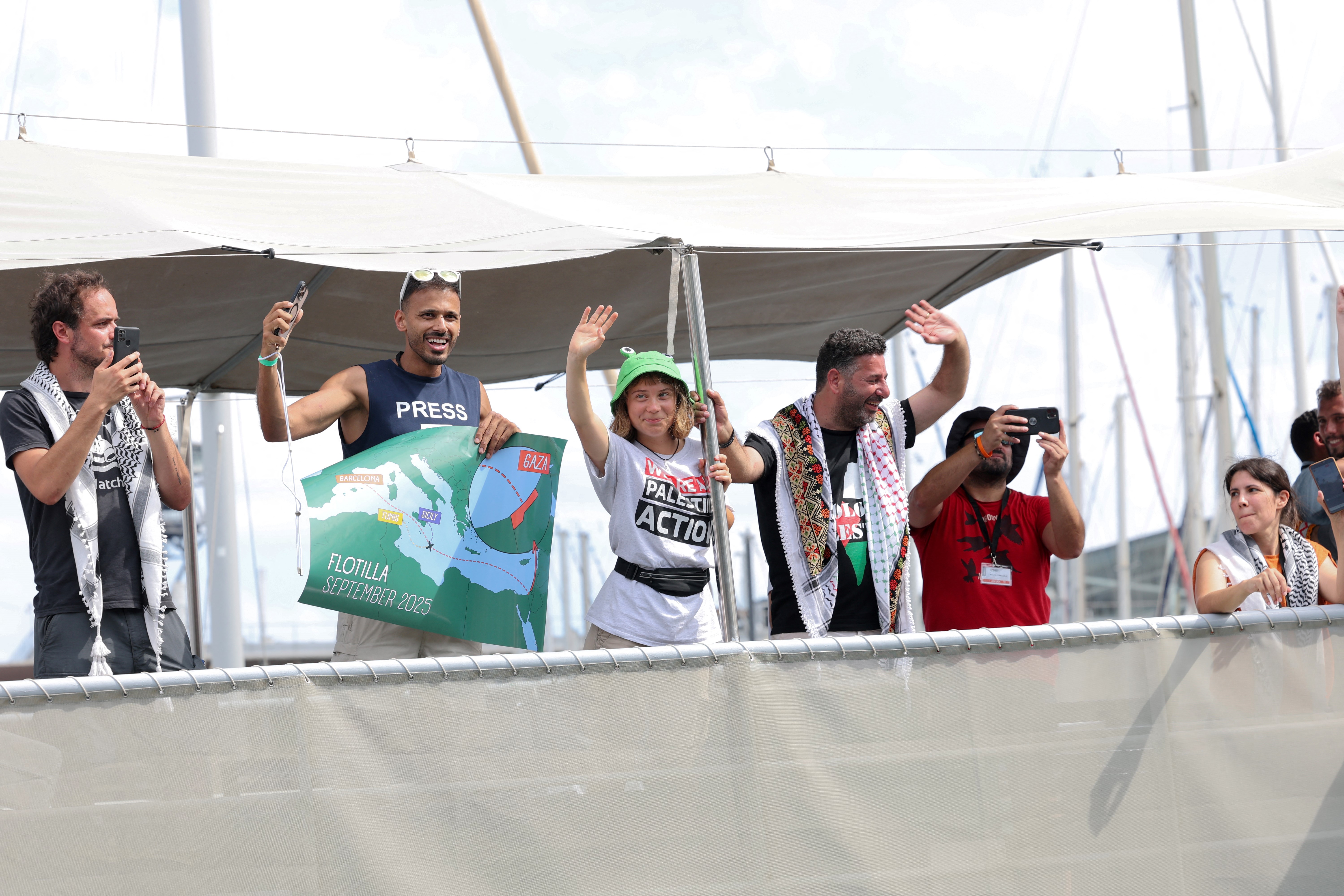 Greta Thunberg y activistas, el 31 de agosto, en el puerto de Barcelona.