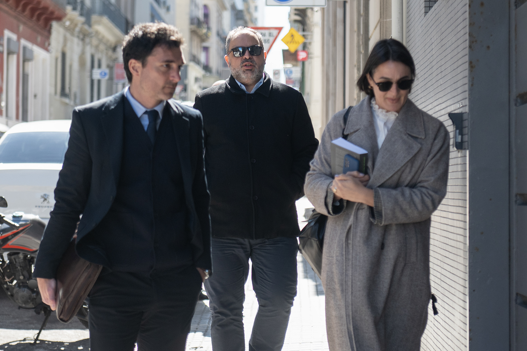 Juan Manuel González, Charles Carrera y Lucía Fernández, llegando al juzgado de la calle Juan Carlos Gómez, el 5 de setiembre, en Montevideo.