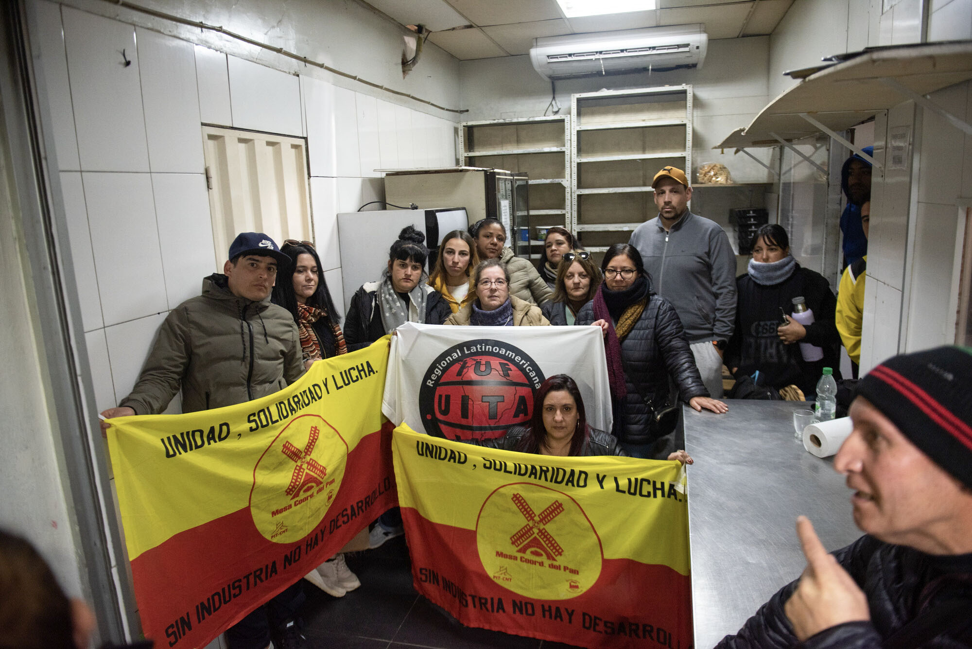 Trabajadores de la panadería La Vienesa durante la ocupación del local, el 18 de junio.