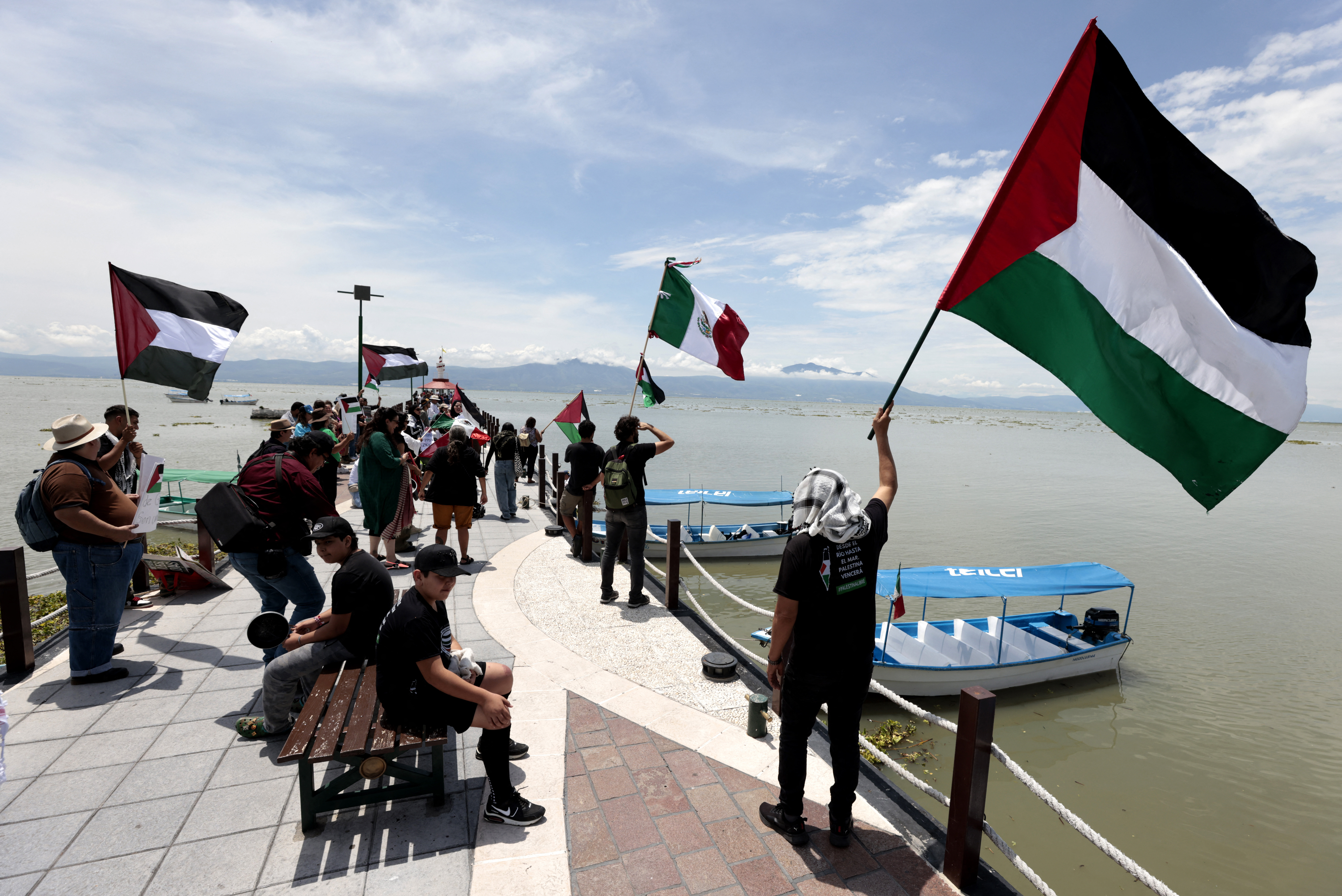 Acción en apoyo a la Flotilla Global Sumud, en el muelle de la laguna de Chapala, en Jalisco, México, el 7 de setiembre.