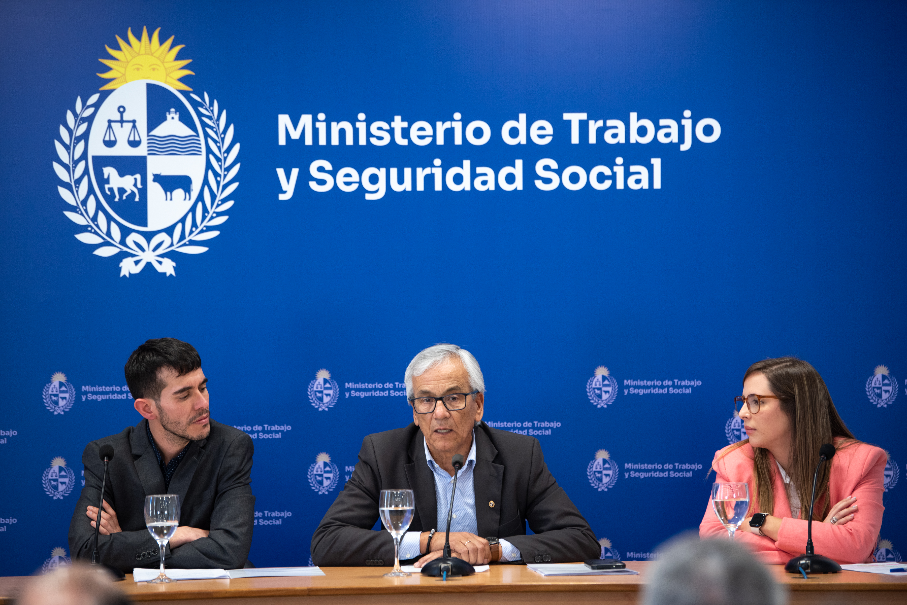 Federico Araya, Juan Castillo y Mariana Chiquiar, el 9 de setiembre, en el Ministerio de Trabajo y Seguridad Social.