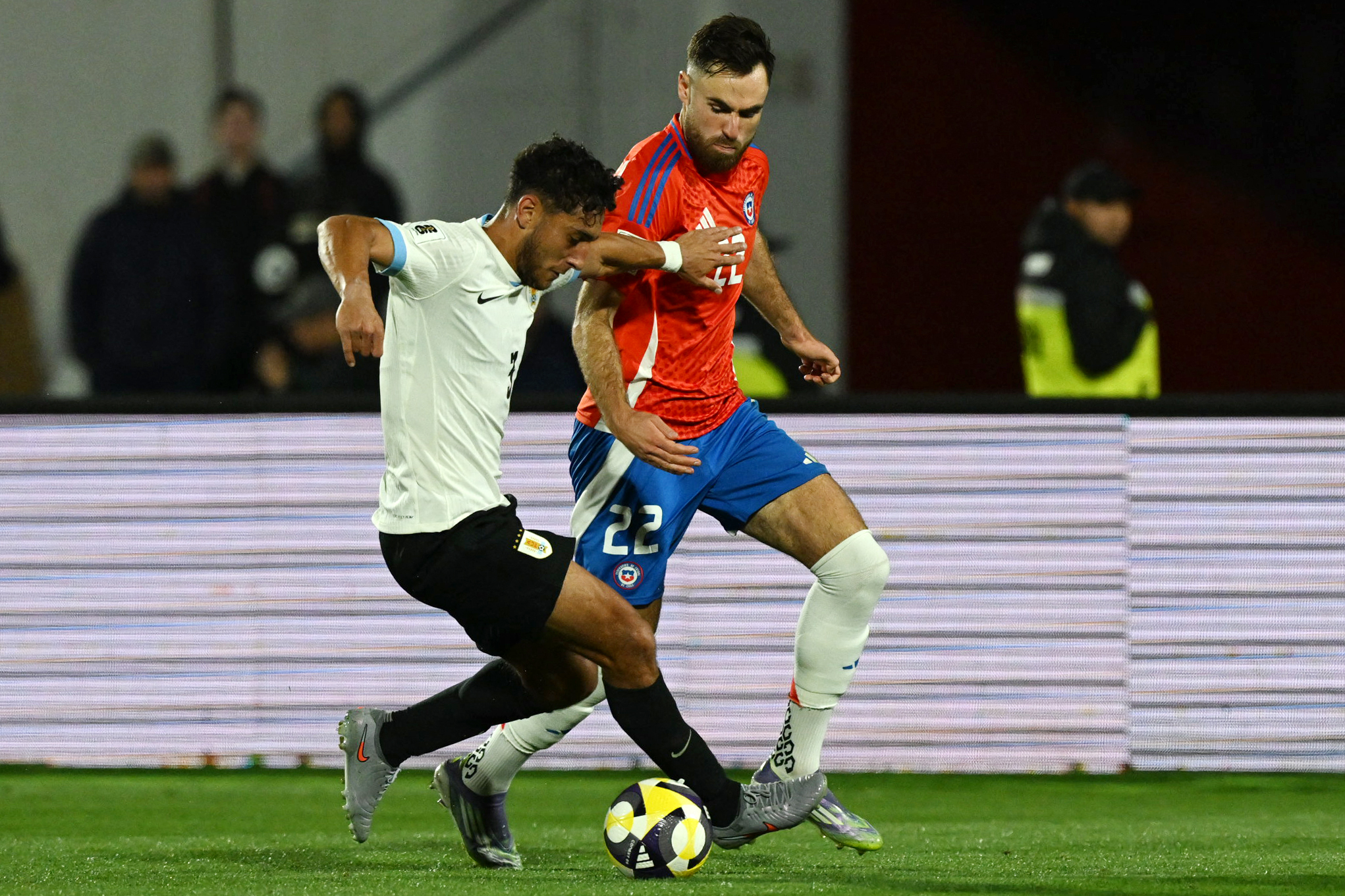 Sebastián Cáceres, de Uruguay, y Ben Brereton, de Chile, el 9 de setiembre, en el estadio Julio Martínez Prádanos, en Santiago.
