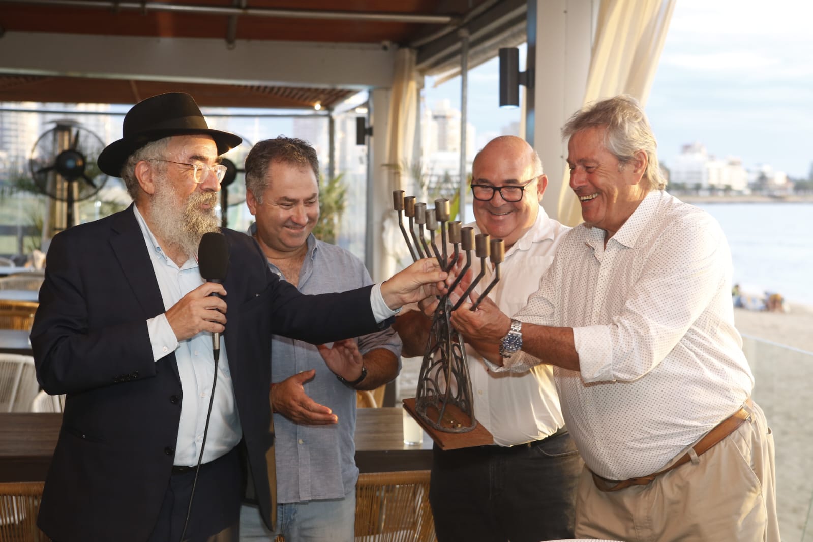El rabino Eliézer Shemtov; Luis Artola, edil del Partido Nacional; Miguel Abella, actual intendente de Maldonado, y Enrique Antía, exintendente de ese departamento. Foto: Intendencia de Maldonado (archivo, marzo de 2025).