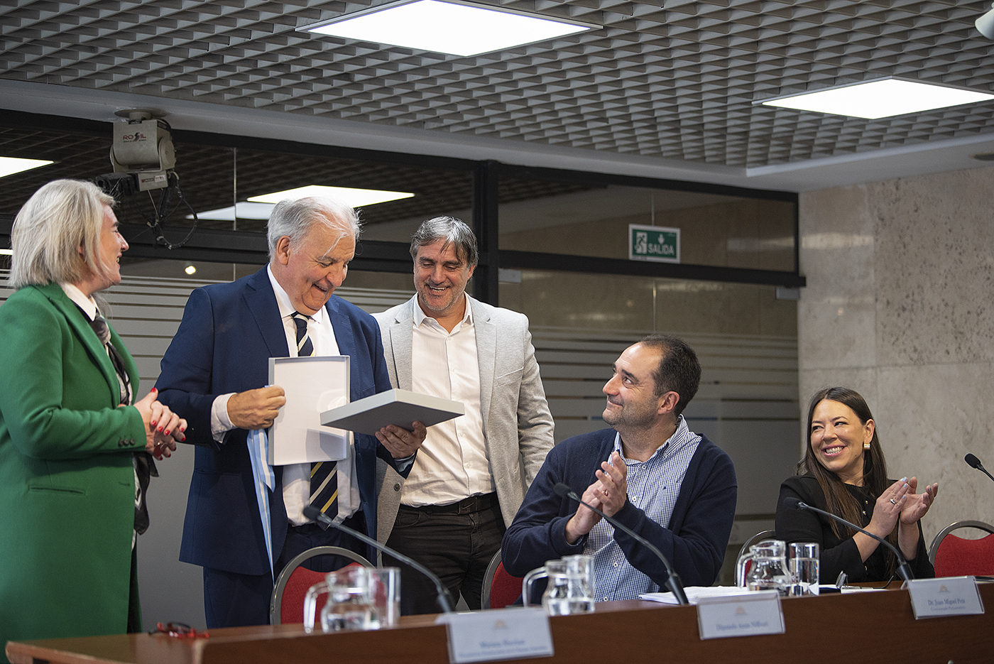 Maríana Sheehan, Juan Miguel Petit, Ariel Cejas, Amin Niffouri y Bettiana Díaz, durante la presentación del informe carcelario 2024, en el Anexo del Palacio Legislativo.