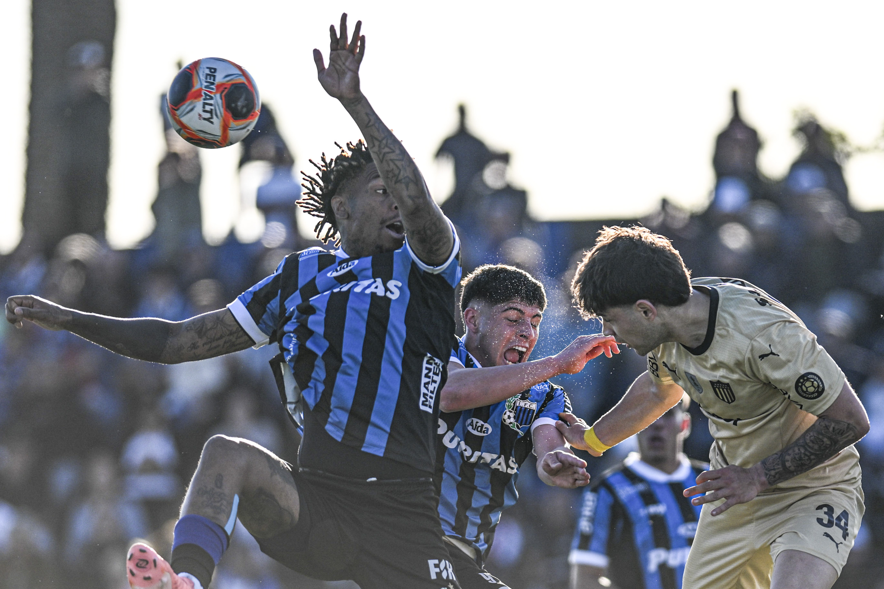 Abel Hernández y Renzo Machado, de Liverpool, y Nahuel Herrera, de Peñarol, el 13 de setiembre, en el estadio Belvedere.