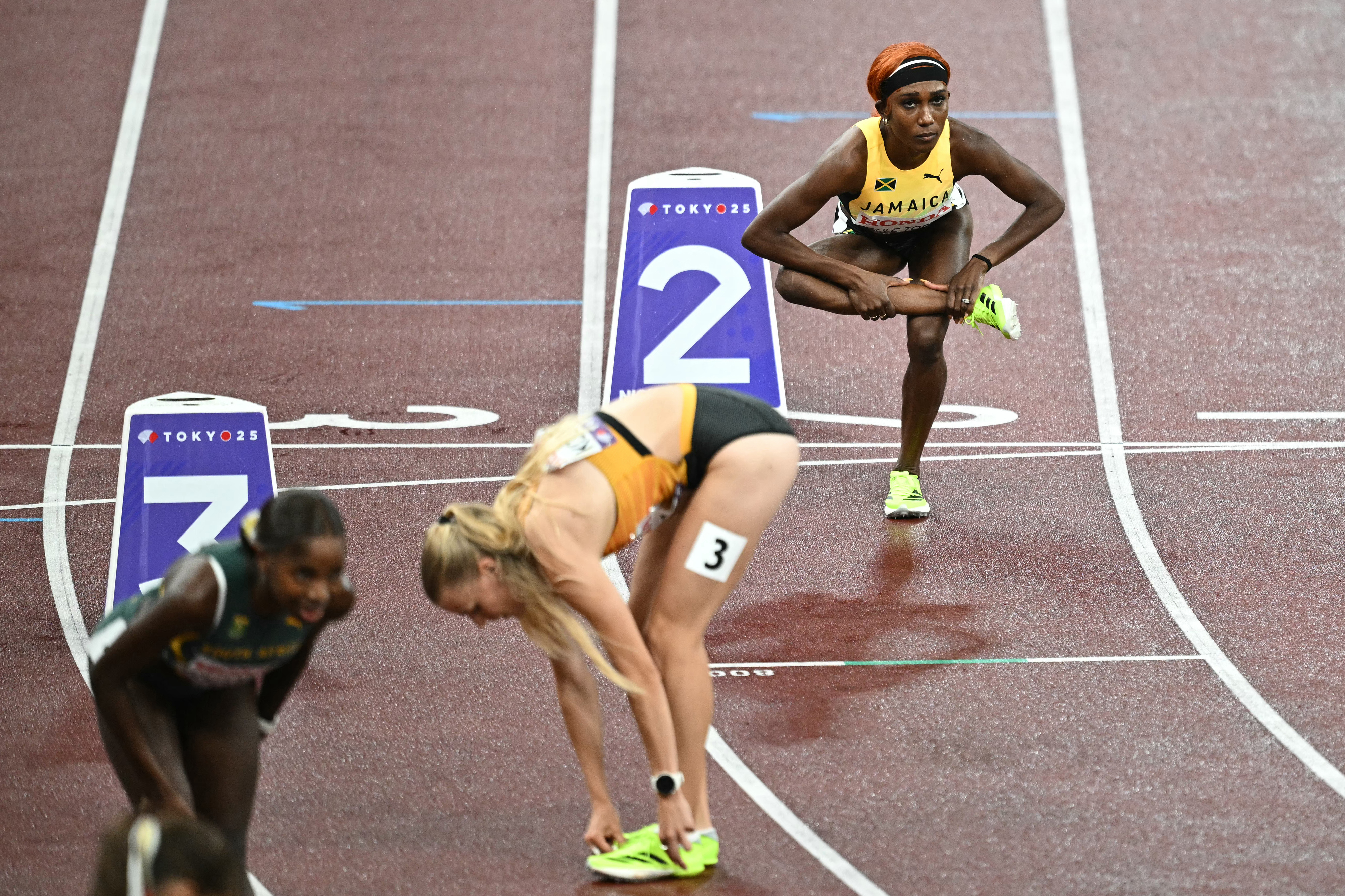 La jamaiquina Natoya Goule-Toppin (d), previo a competir en las eliminatorias de los 800 m femeninos durante el Campeonato Mundial de Atletismo, el 18 de setiembre, en Tokio. Foto: Philip Fong, AFP.