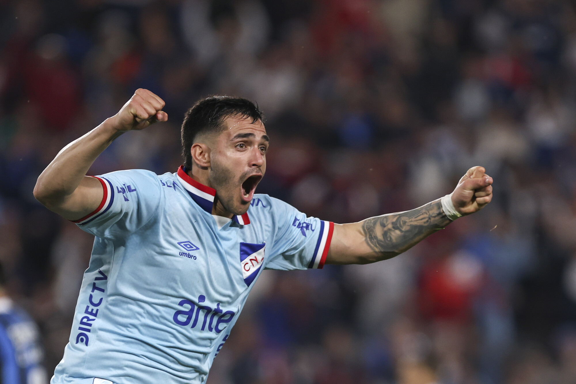 Maximiliano Gómez, de Nacional, festeja el gol convertido por Nicolás López.