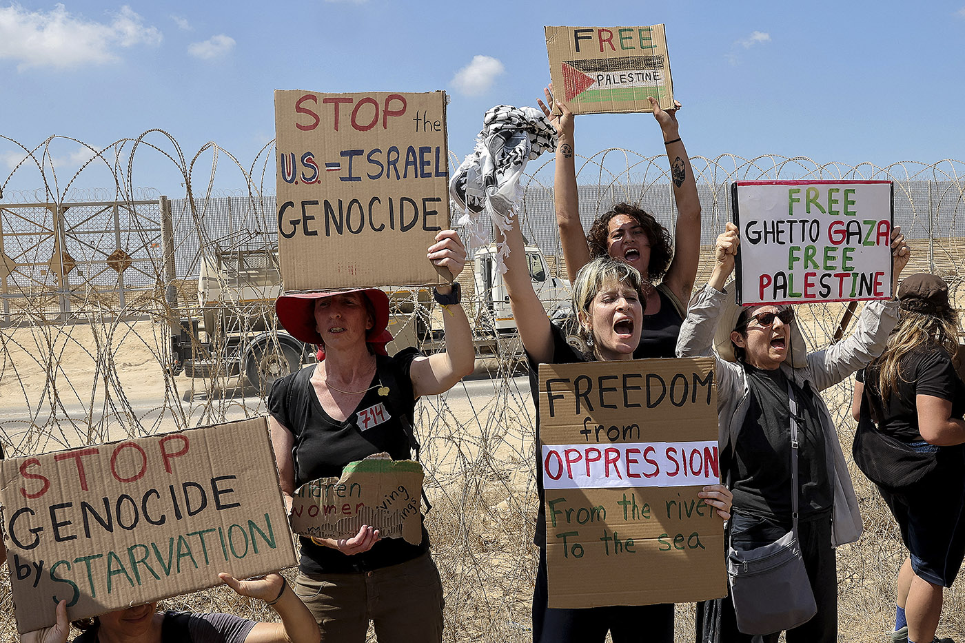 Activistas israelíes de izquierda en la frontera con la Franja de Gaza, exigiendo el fin de la operación militar israelí.