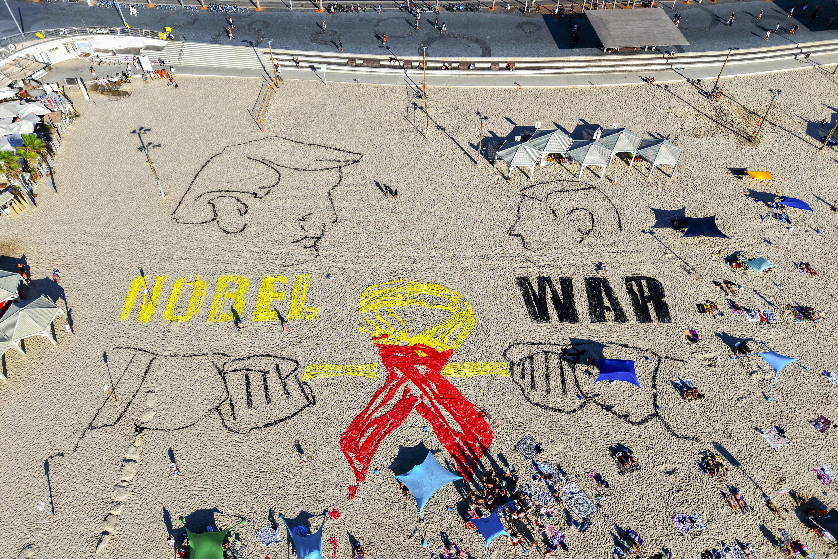 Instalación con las imágenes de Donald Trump y el primer ministro israelí, Benjamin Netanyahu, frente a las oficinas de la embajada de Estados Unidos, el 13 de setiembre, en Tel Aviv.