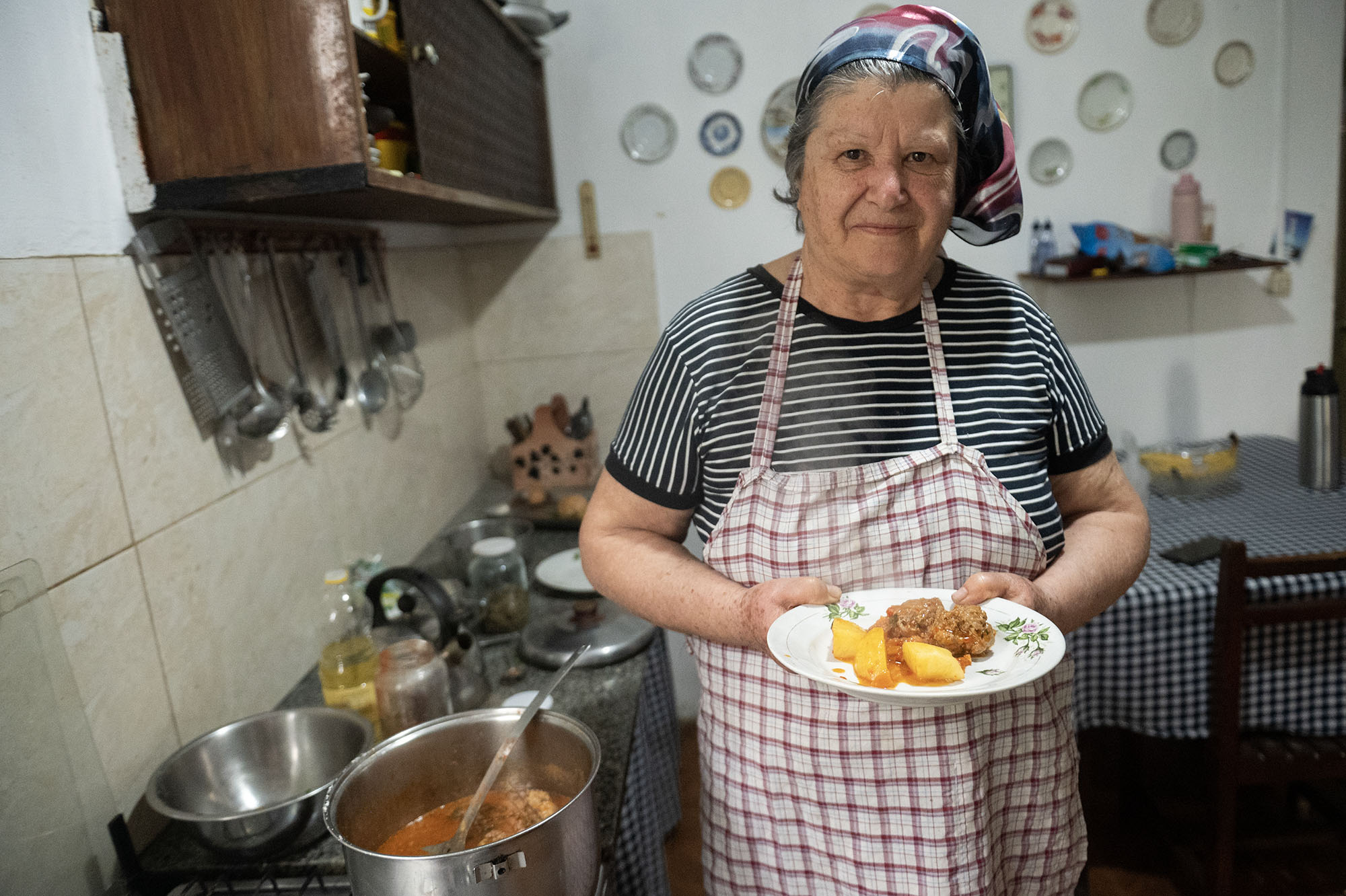 Laura Bonifacino, en su casa, cocinando albóndigas caceras.