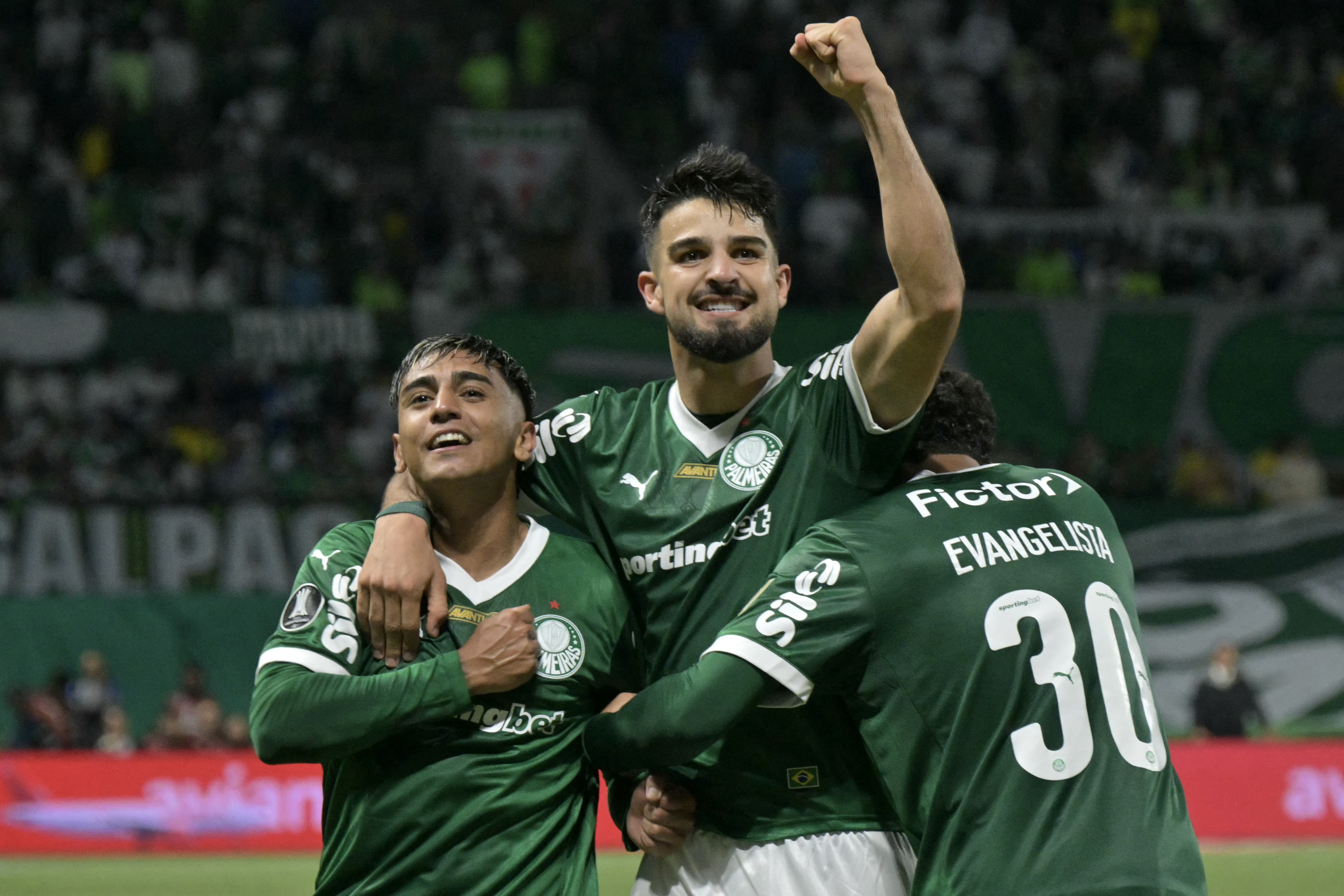 José Manuel López de Palmeiras festeja el tercer gol de su equipo junto a Facundo Torres y Lucas Evangelista, durante el partido de vuelta por los cuartos de final de la Copa Libertadores frente a River Plate, en el estadio Allianz Parque en São Paulo, el 24 de setiembre.