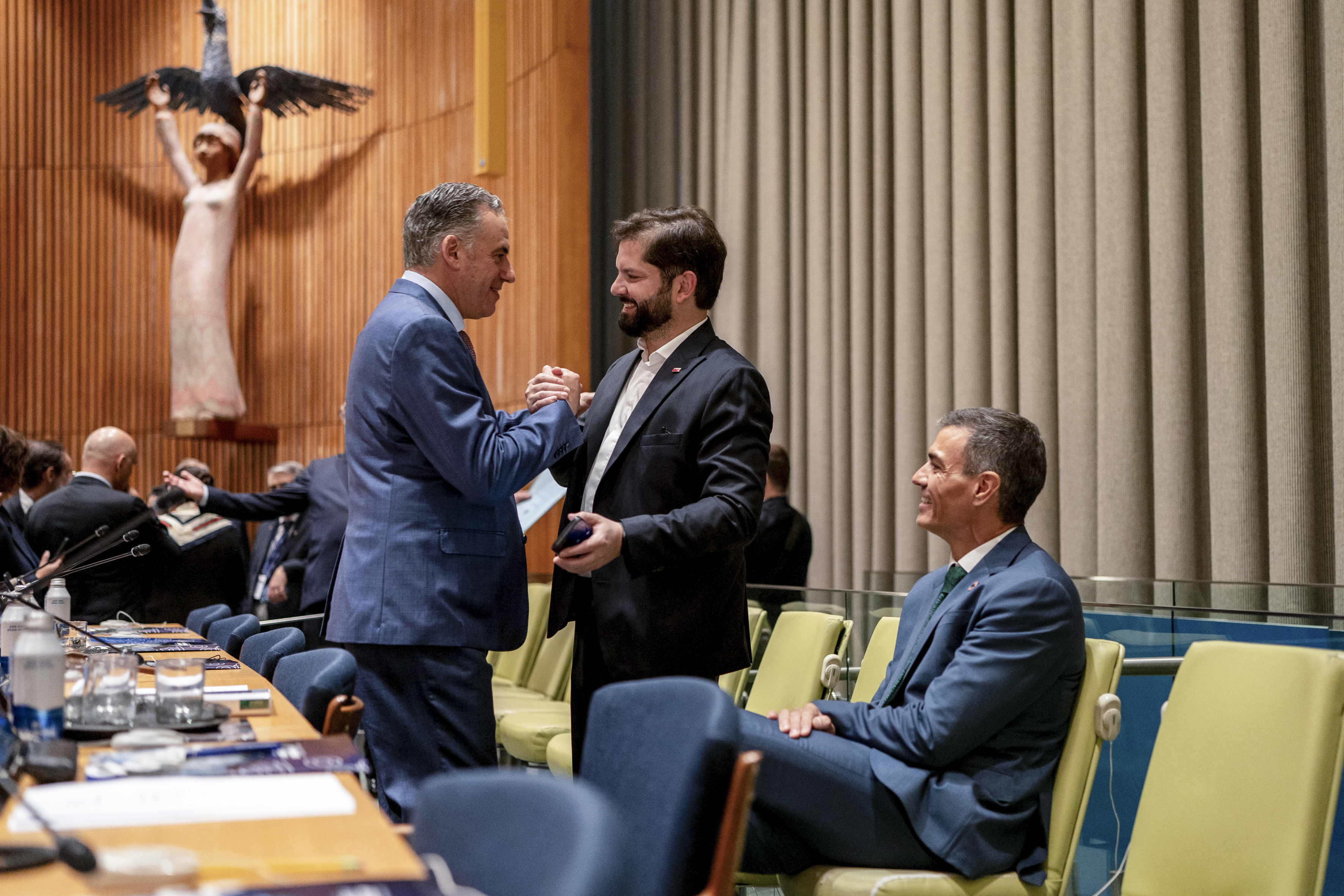 Yamandú Orsi, Gabriel Boric y Pedro Sánchez, el 24 de setiembre, en Nueva York.