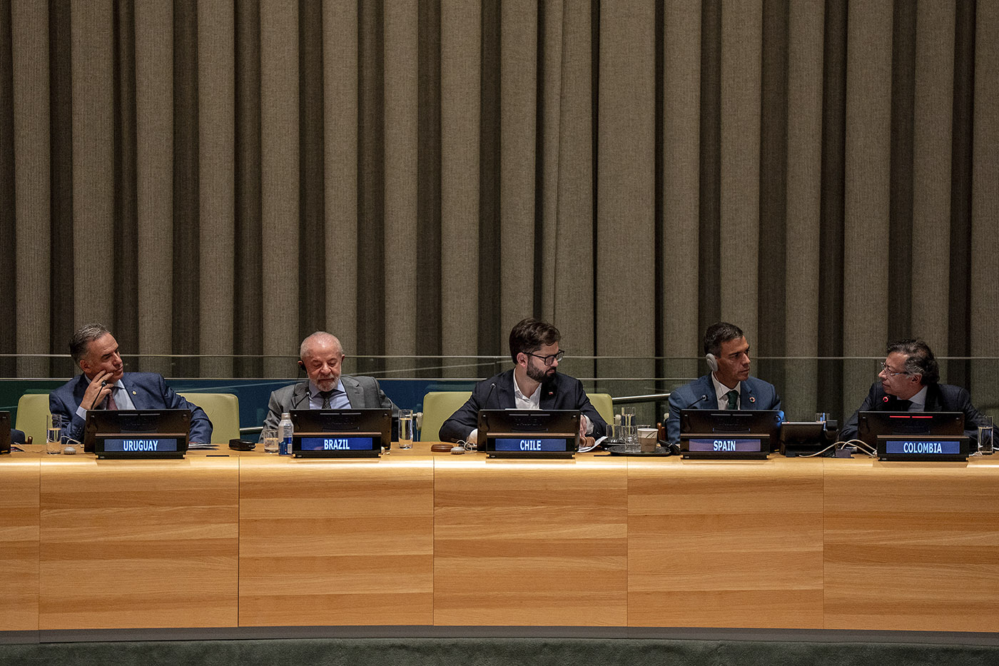 Los presidentes Yamandú Orsi, Luiz Inácio Lula da Silva, Gabriel Boric, Pedro Sánchez y Gustavo Petro, durante el segundo foro "En defensa de la democracia, combatiendo extremismos", en el marco de la Asamblea de Naciones Unidas.