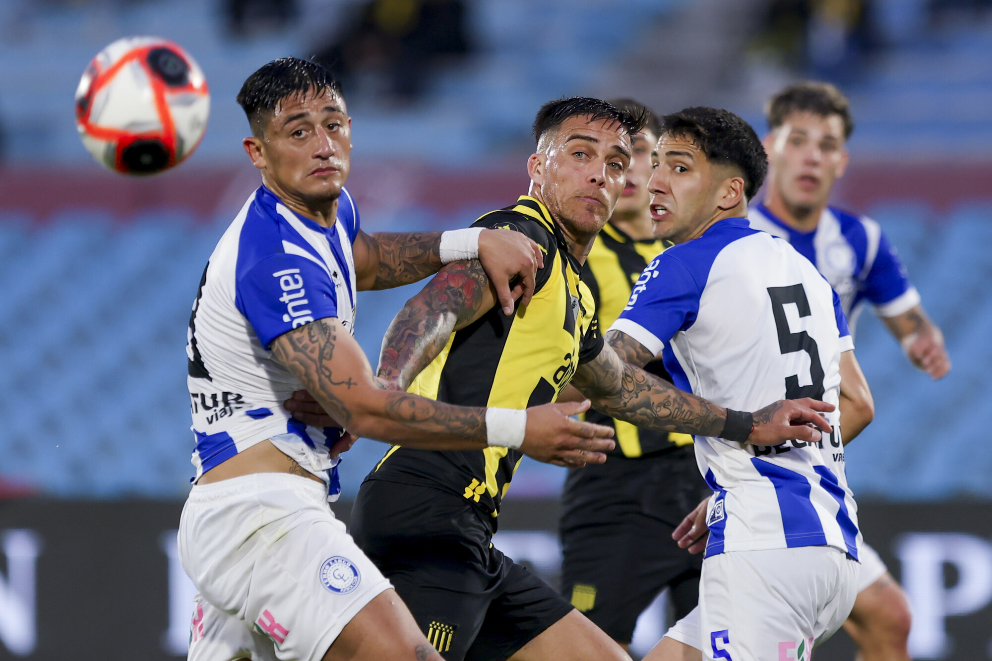 Mauro Brasil, de Cerro Largo, Javier Méndez, de Peñarol y Alan Di Pippa, de Cerro Largo, en el estadio Centenario.