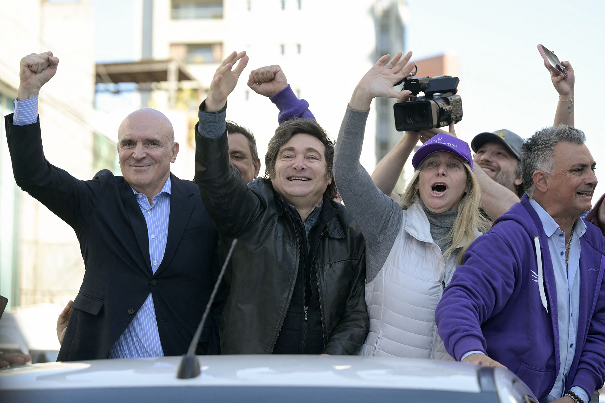José Luis Espert, Javier Milei y Karina Milei, el 27 de agosto, durante una caravana en Lomas de Zamora, provincia de Buenos Aires, Argentina.