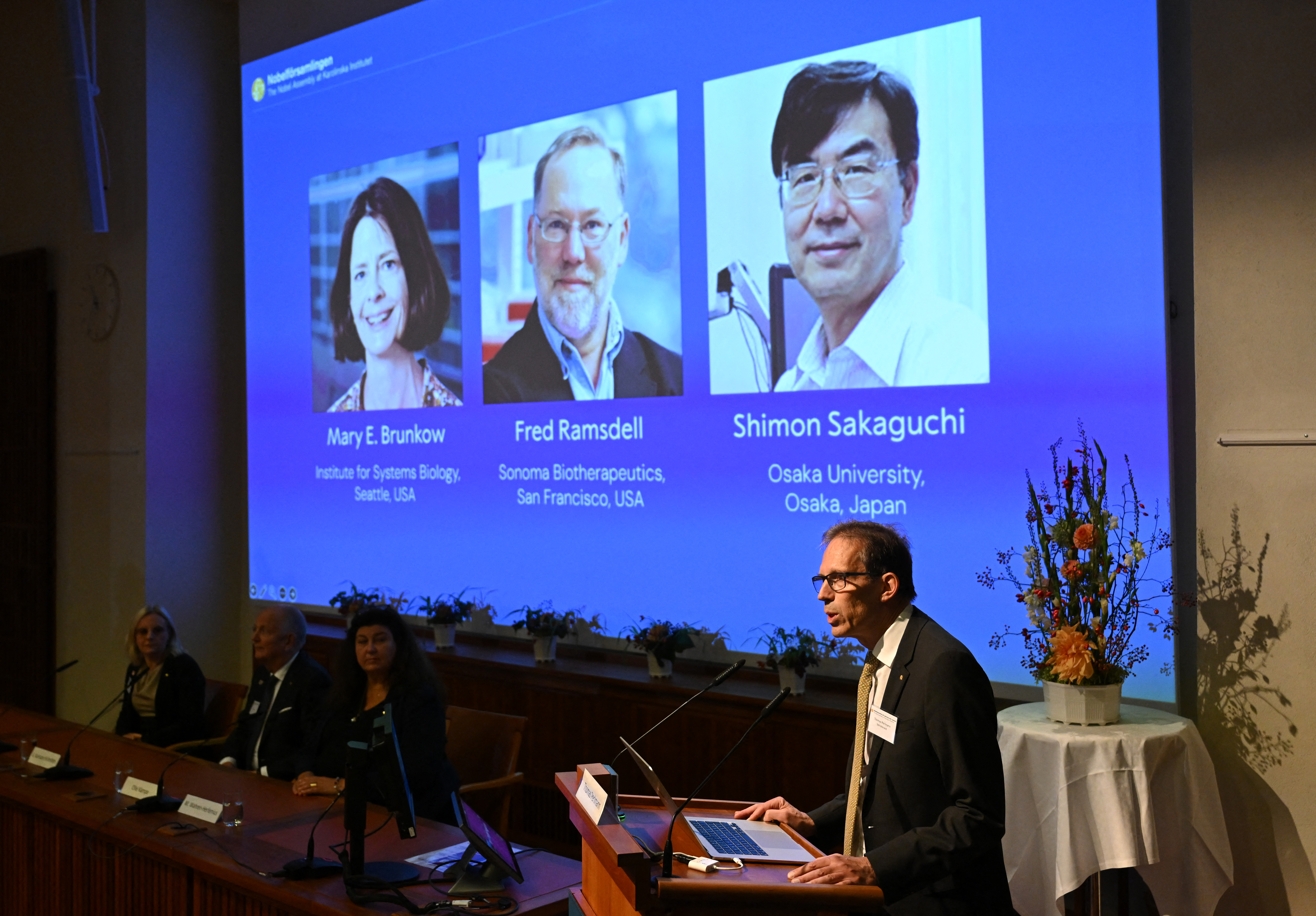 Thomas Perlmann, Secretario General del Comité Nobelse, muestra a los ganadores del Premio Nobel de Medicina 2025, Mary E Brunkow, Fred Ramsdell y Shimon Sakaguchi, el 6 de octubre, en el Instituto Karolinska de Estocolmo, Suecia.