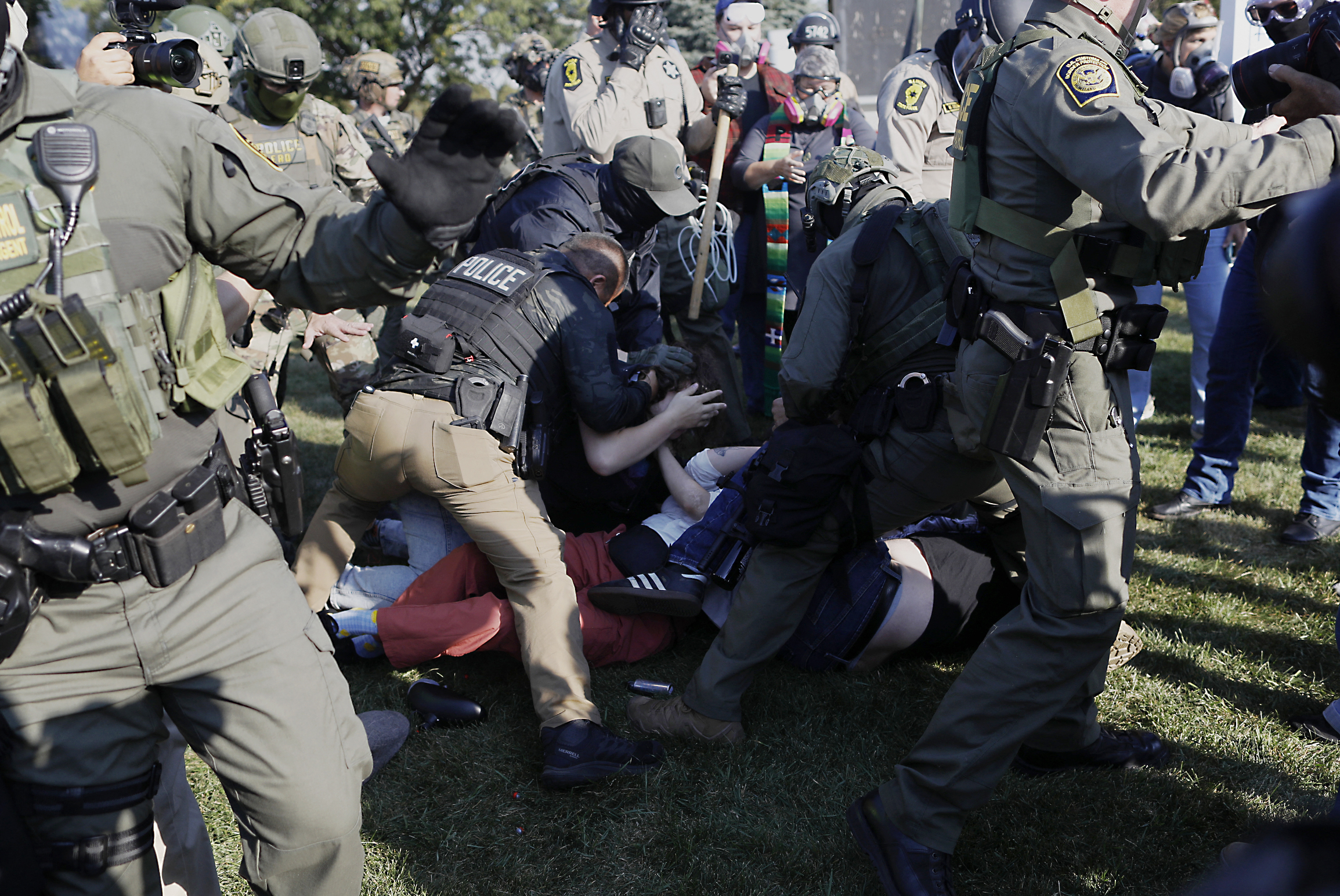 Agentes de Aduanas y Protección Fronteriza de Estados Unidos detienen a manifestantes, el 3 de octubre, mientras cientos de ellos se congregan cerca de una instalación del Servicio de Inmigración y Control de Aduanas en Broadview, Illinois.