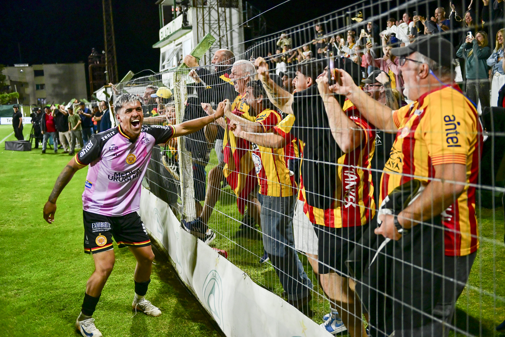 Hinchas y jugadores de Progreso festejan la victoria 1-0 frente a Plaza Colonia, el 10 de octubre, en el Parque Prandi de Colonia.
