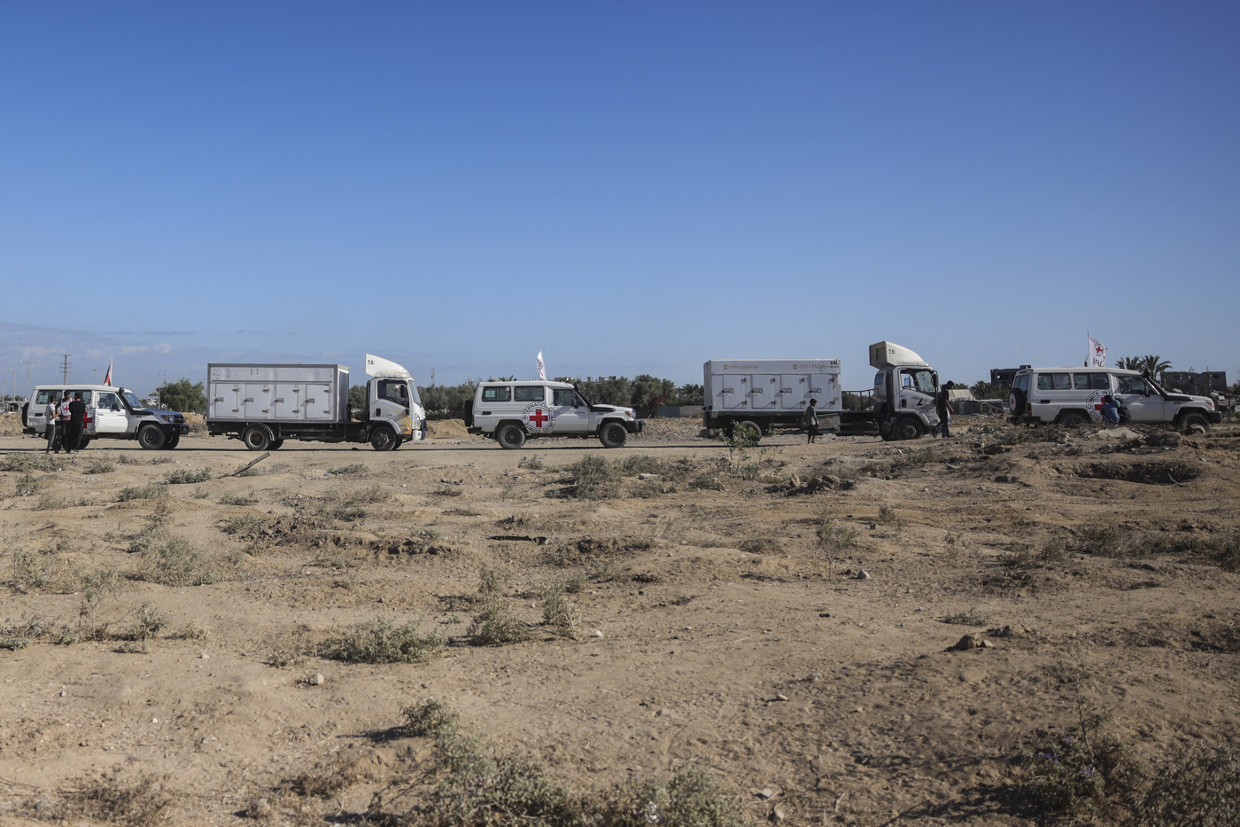Vehículos del Comité Internacional de la Cruz Roja, rumbo al cruce de Kissufim, para recibir los cuerpos de los palestinos que se encuentran bajo custodia israelí.
