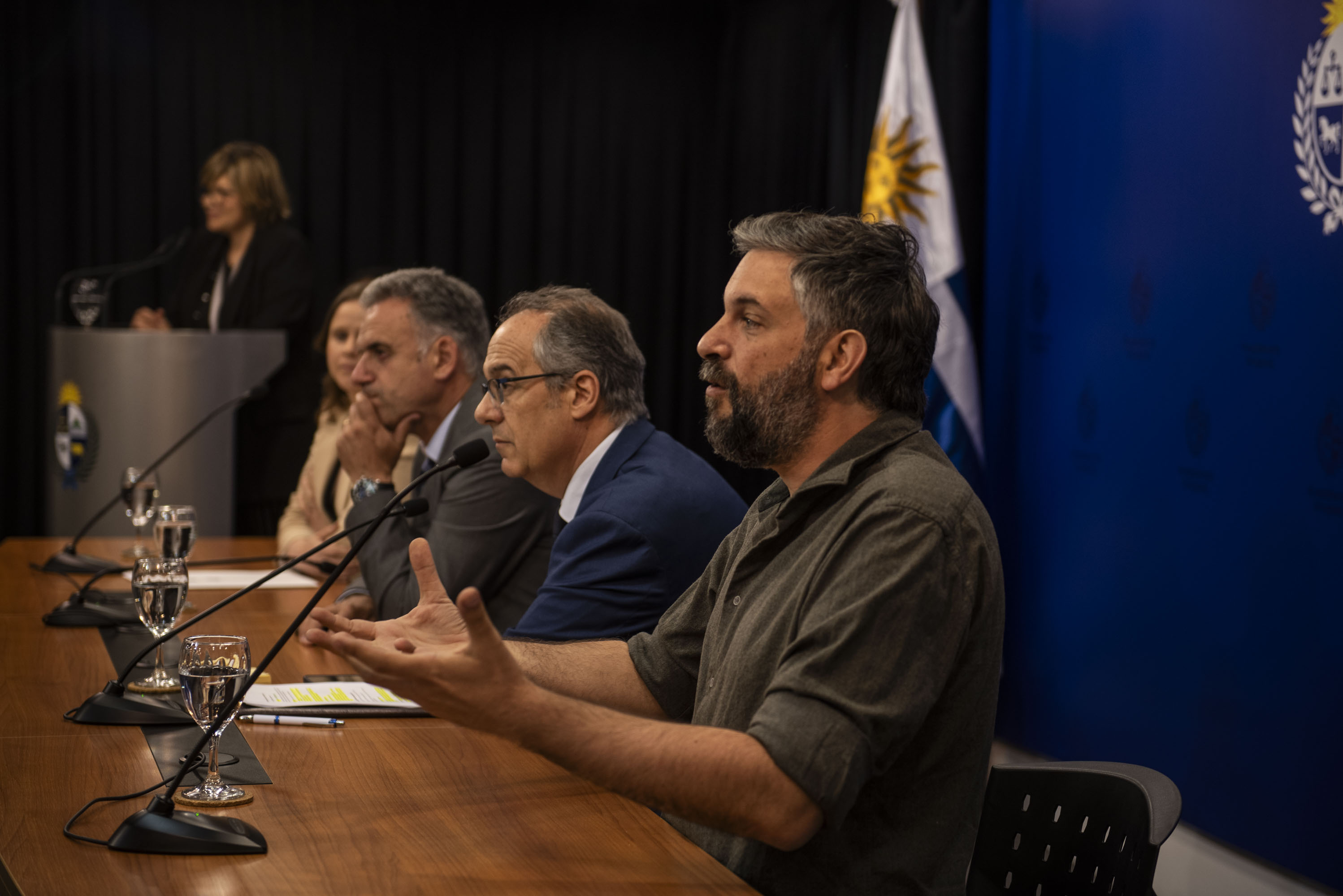 Rocío Schiappapietra, Yamandú Orsi, José Carlos Mahía y Gabriel Calderón, el 20 de octubre, en la Torre Ejecutiva.