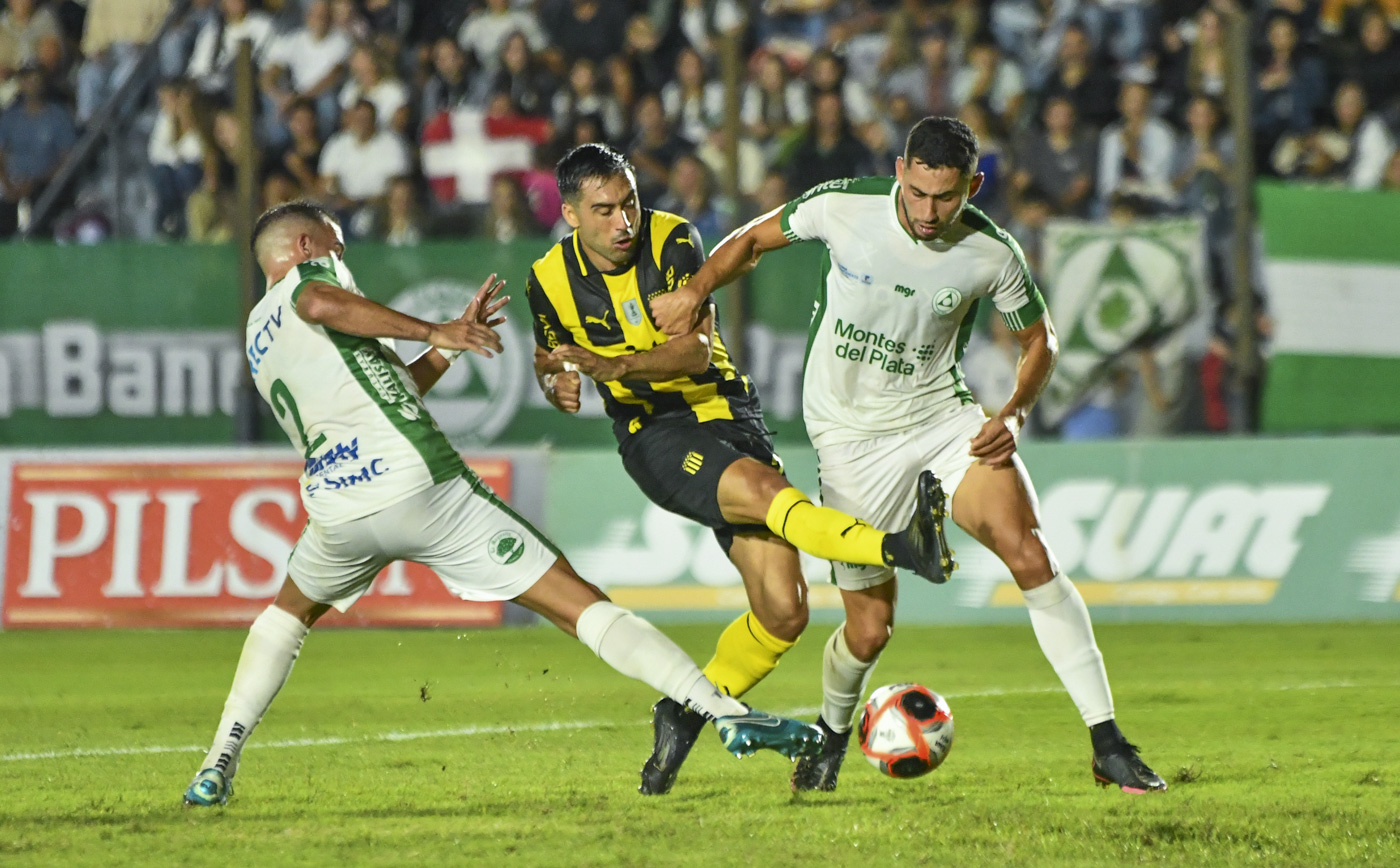 Máximo Lorenzi, de Plaza Colonia, Jaime Báez, delantero de Peñarol, y Ezequías Redín, de Plaza Colonia (archivo, mayo de 2025).