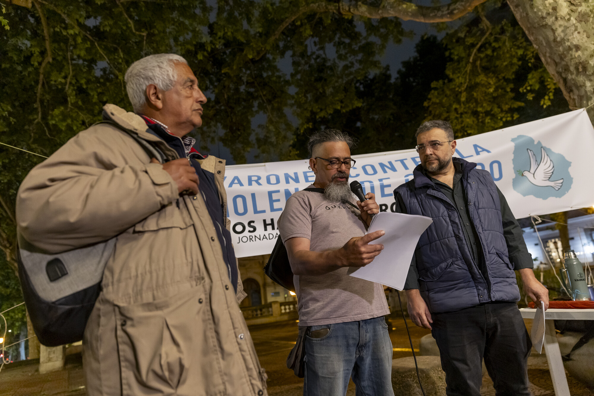 Wilson Falero de Varones por la Igualdad, Rodrigo Virmercatti del Colectivo VARRA y Fernando Rodríguez Añón del Colectivo Movilización, durante la convocatoria en Plaza Cagancha.