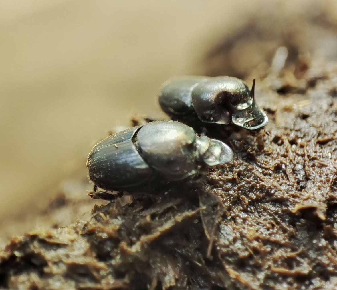 Pareja de escarabajos de la especie _Onthophagus hircus_ . Foto: Gianella Castro.