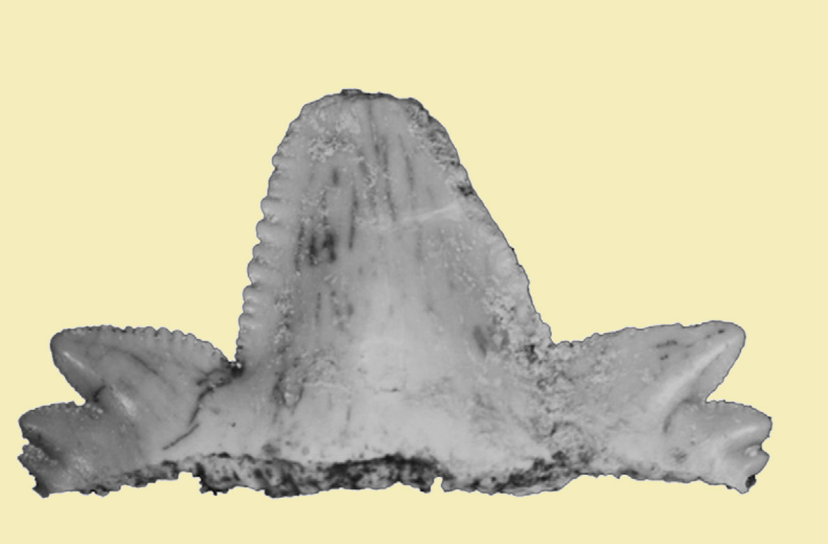 Diente del tiburón _Priohybodus arambourgi_ de depósitos de Tacuarembó. Foto: gentileza Matías Soto.