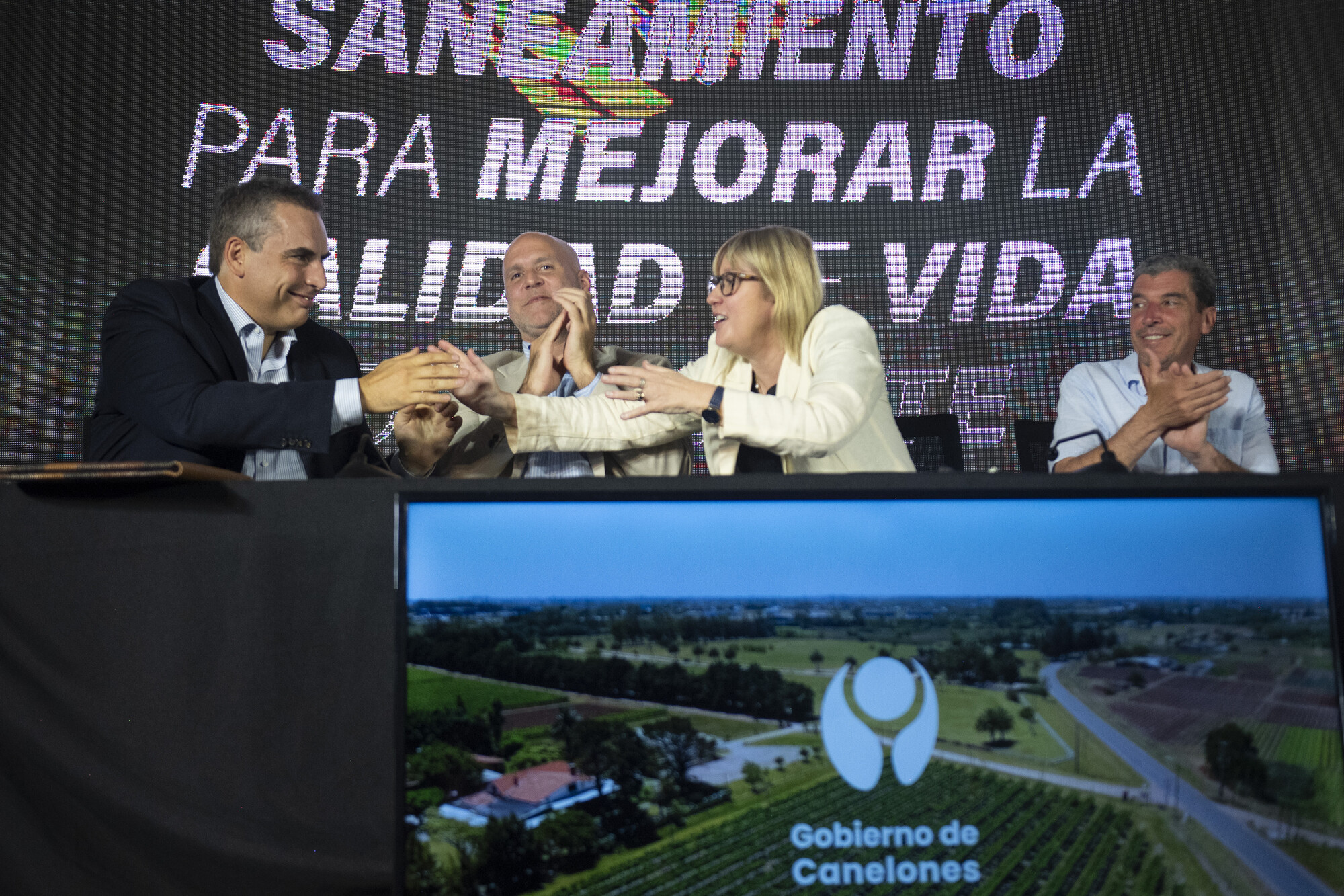 Pablo Ferreri, presidente de OSE; Francisco Legnani, intendente de Canelones; Cristina Lustemberg, ministra de Salud Pública, y Ernesto Capano, alcalde del Municipio de Atlántida, durante la firma del convenio en el Espacio Dínamo de Atlántida.