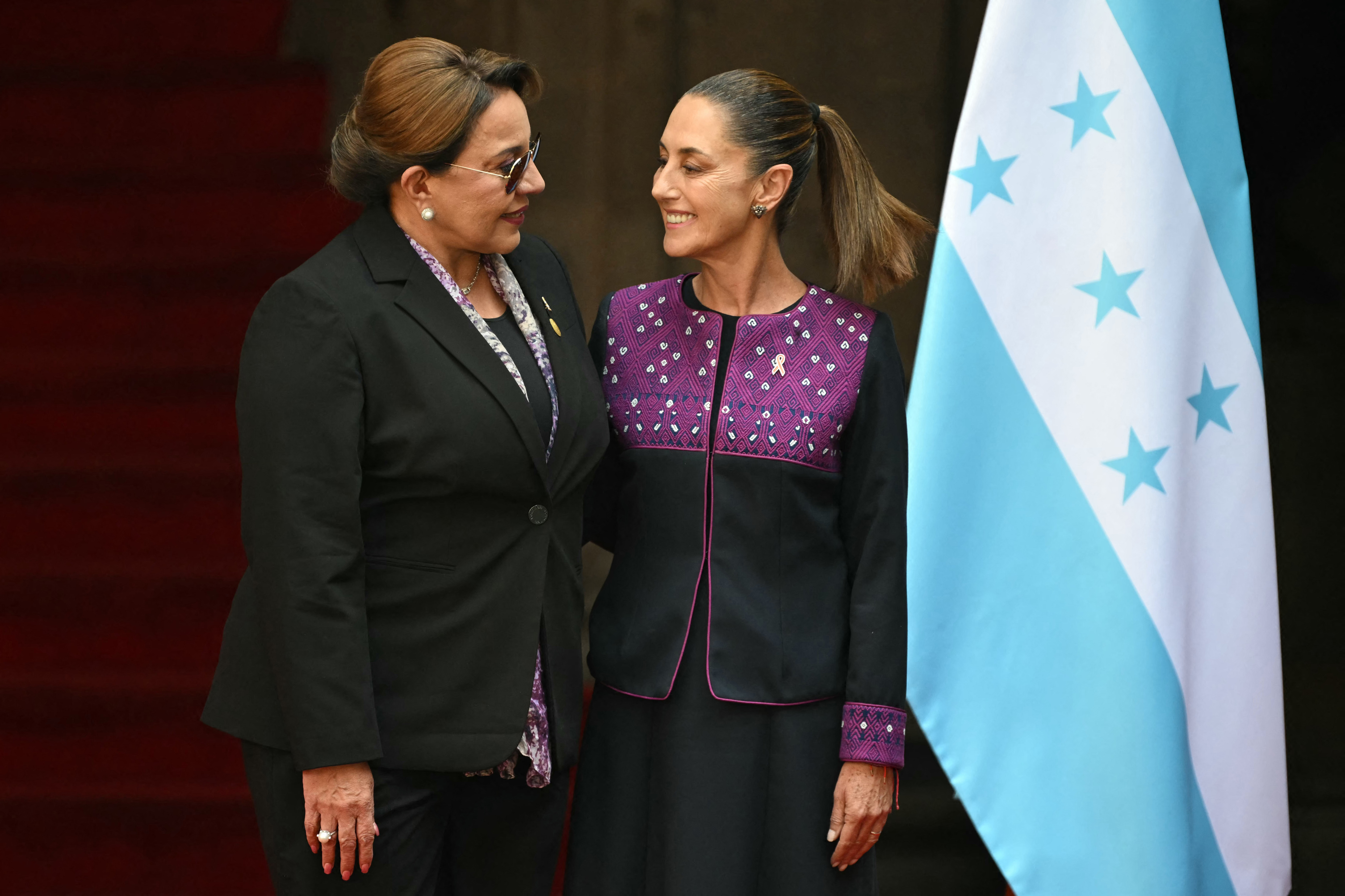 Xiomara Castro y Claudia Sheinbaum, durante una ceremonia oficial de bienvenida en el Palacio Nacional en Ciudad de México, el 25 de noviembre.