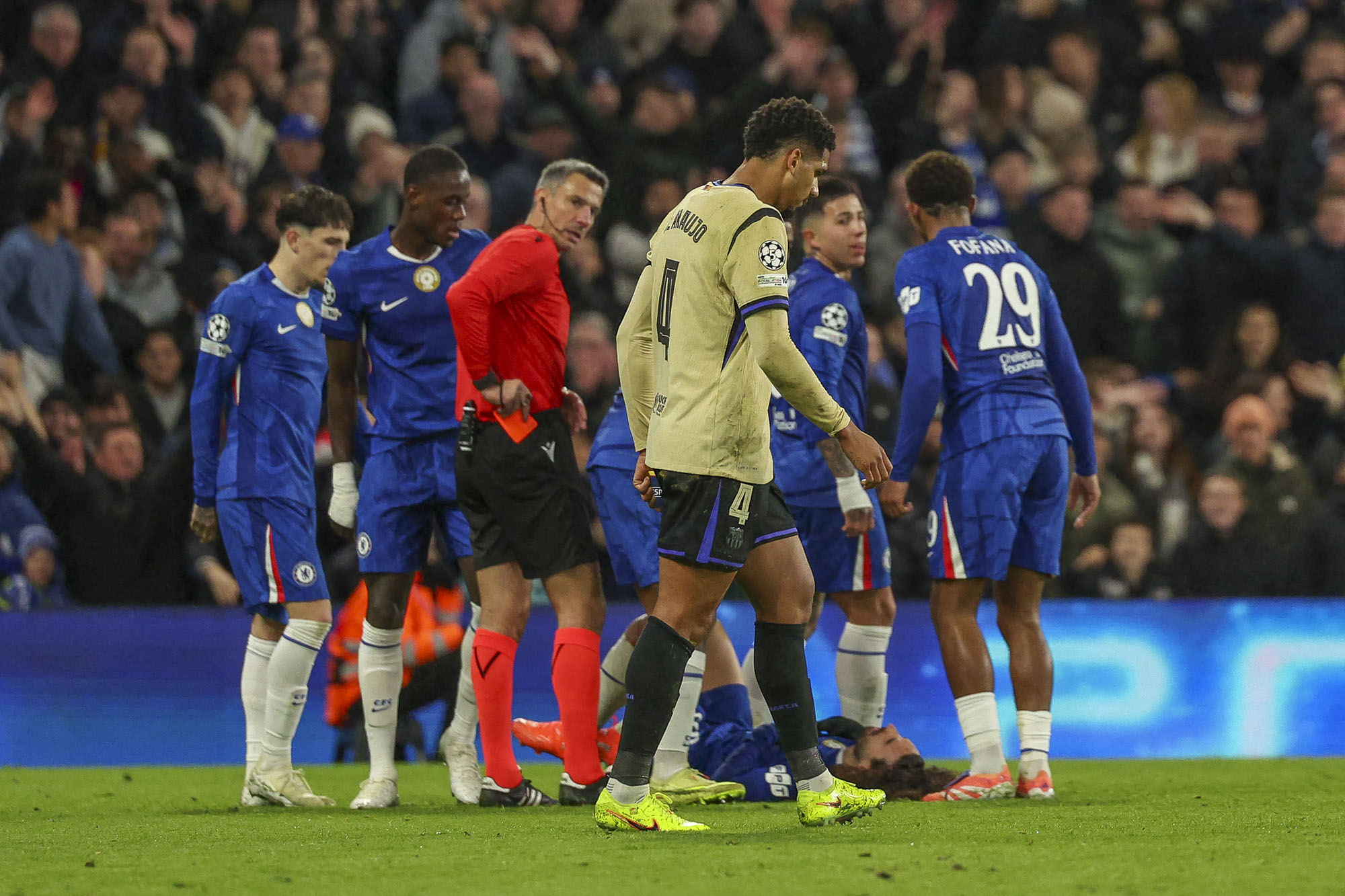 Ronald Araújo se va expulsado durante el partido de la fase de liga de la UEFA Champions League entre el Chelsea y el Barcelona en Stamford Bridge, el 25 de noviembre.
