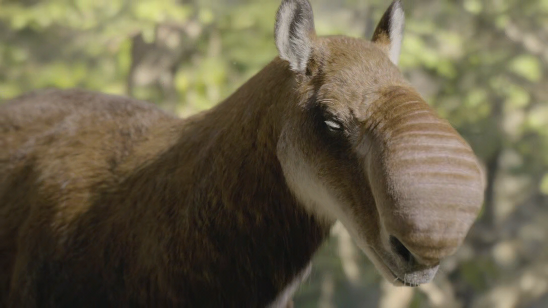 La macrauquenia resoplando con su trompa filtradora de polvo al estilo saiga. Fotograma de _Prehistoric Planet Ice Age_.
