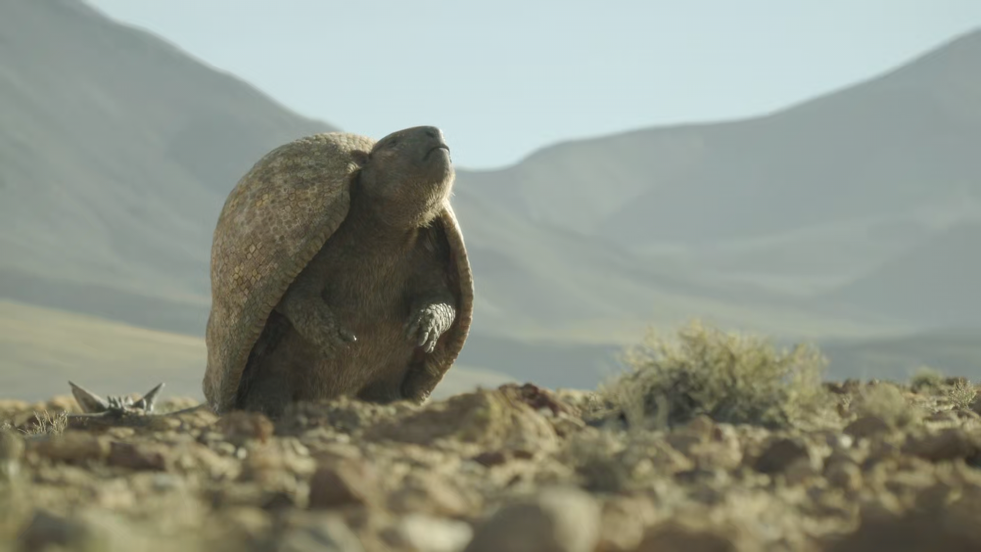 Gliptodonte _Doedicurus_ sobre sus patas traseras. Fotograma de _Prehistoric Planet Ice Age_.