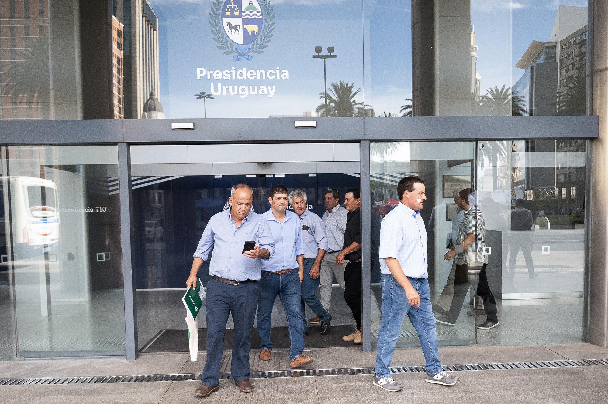 Productores y dirigentes gremiales del sector lácteo, luego de la reunión con Yamandú Orsi y Alfredo Fratti, el 11 de diciembre, en la Torre Ejecutiva.