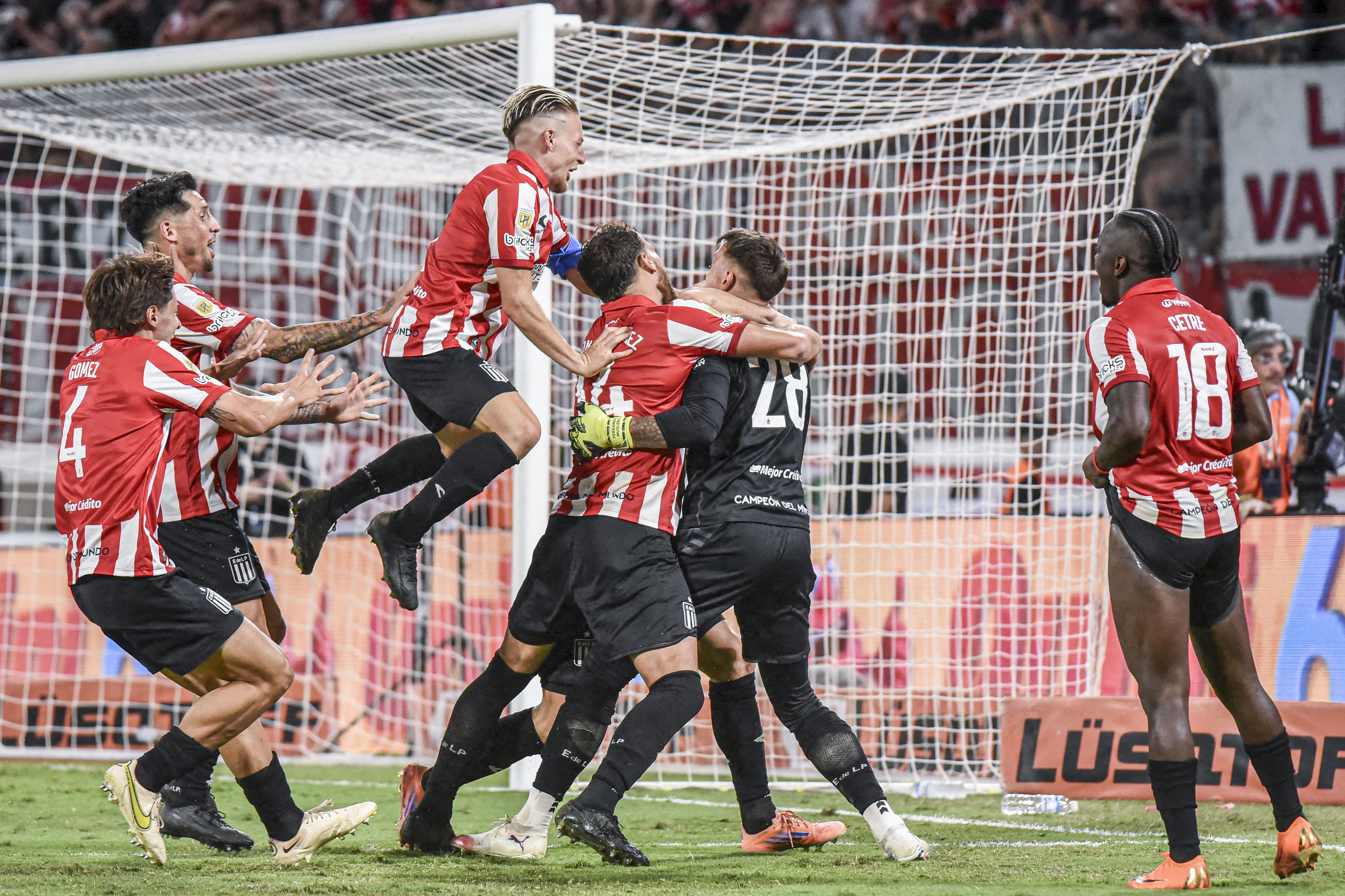 Fernando Muslera, de Estudiantes de la Plata, festeja con sus compañeros tras ganarle a Racing, el 13 de diciembre, en Santiago del Estero.