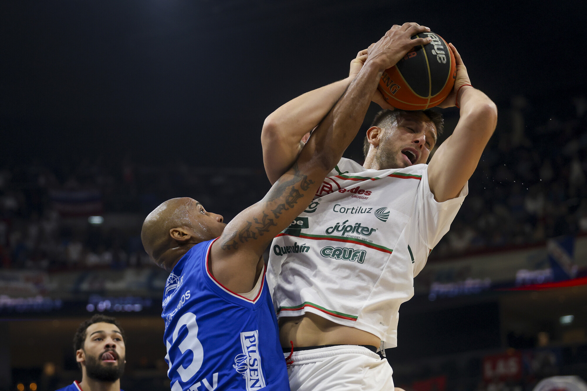 Ernesto Oglivie, de Nacional, Agustín Zuvich, de Aguada, durante la quinta final de la Liga Uruguaya de Básquetbol, el 16 de mayo, en el Antel Arena.