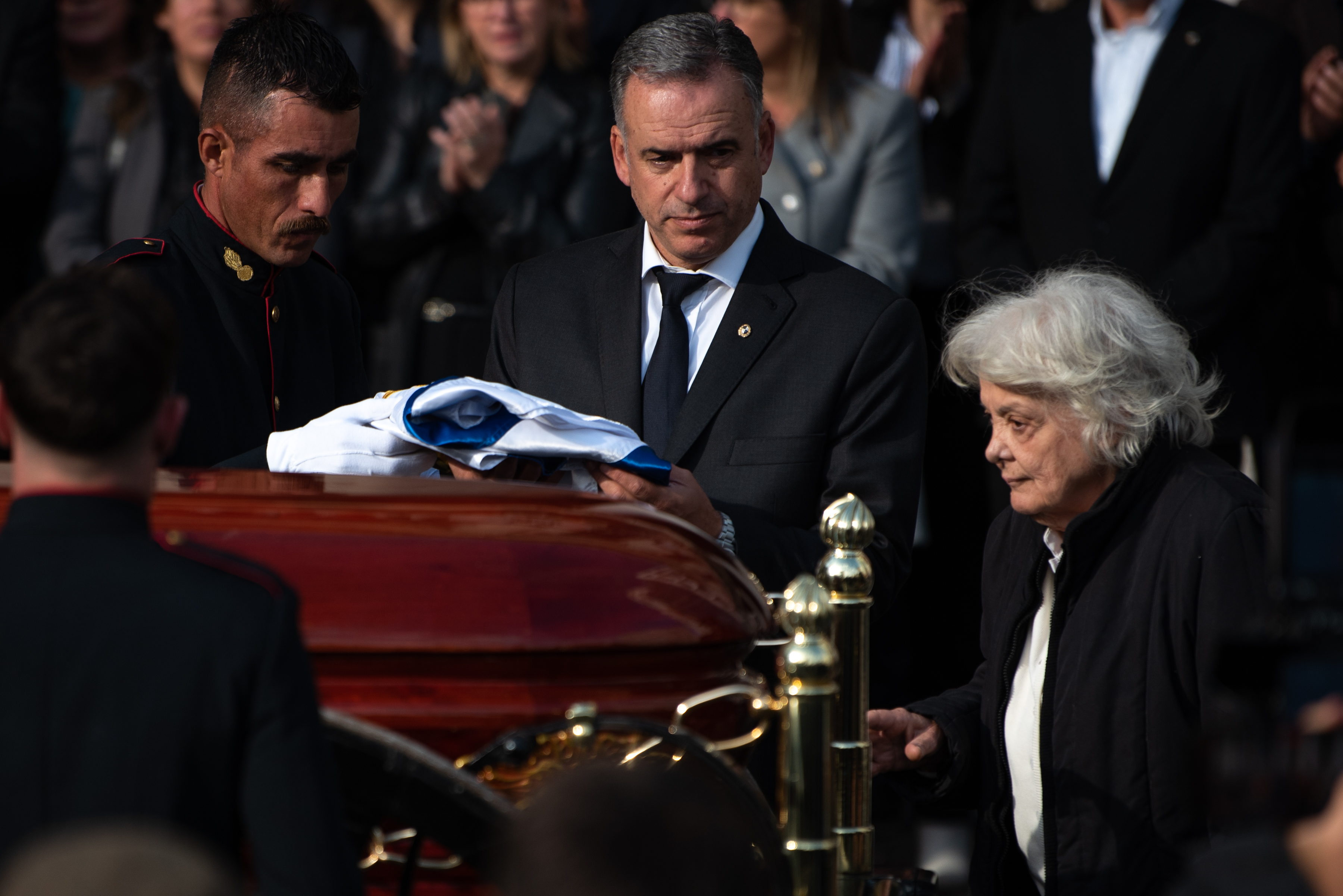 Yamandú Orsi y Lucía Topolansky a la salida del cotejo fúnebre, el 14 de mayo, en el Palacio Santos.