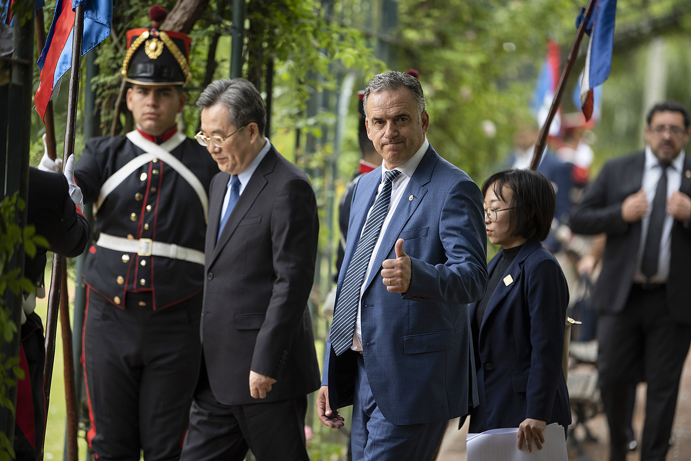 El vice primer ministro Ding Xuexiang, y el presidente Yamandú Orsi, durante la visita del jerarca chino, el 4 de noviembre de 2025.
