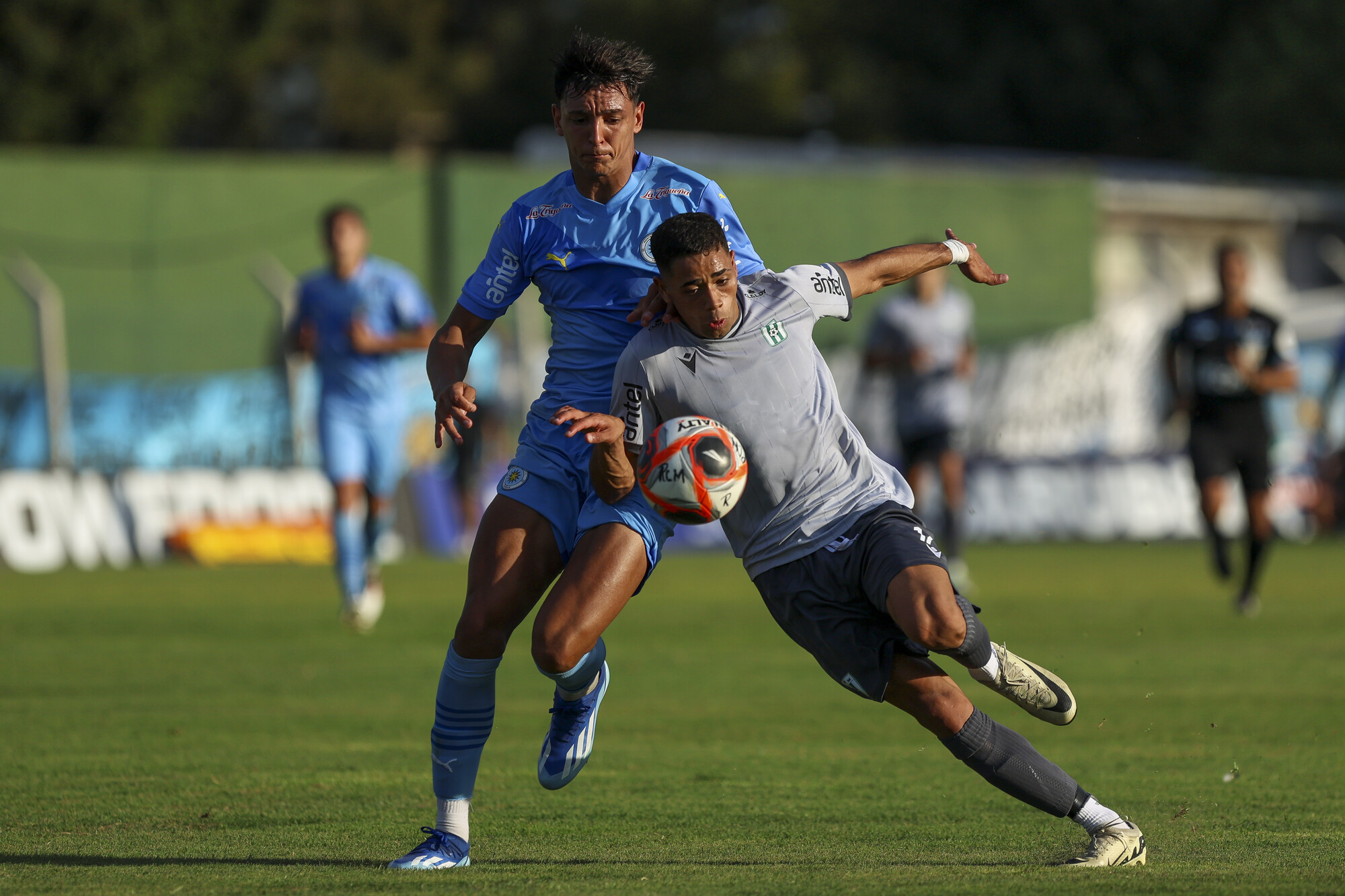 Eduardo Agüero, defensa de Montevideo City Torque, y Esteban da Silva, delantero de Racing de Montevideo. (archivo, febrero de 2025)