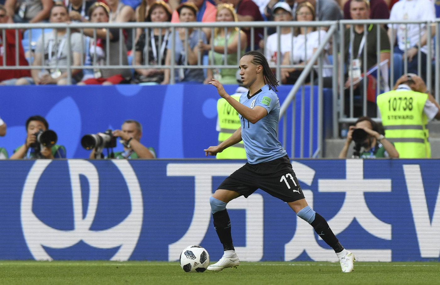 Diego Laxalt, de Uruguay, en el juego Uruguay - Rusia por la tercera fecha de la primera fase del Mundial 2018, el 25 de junio en el Samara Arena.