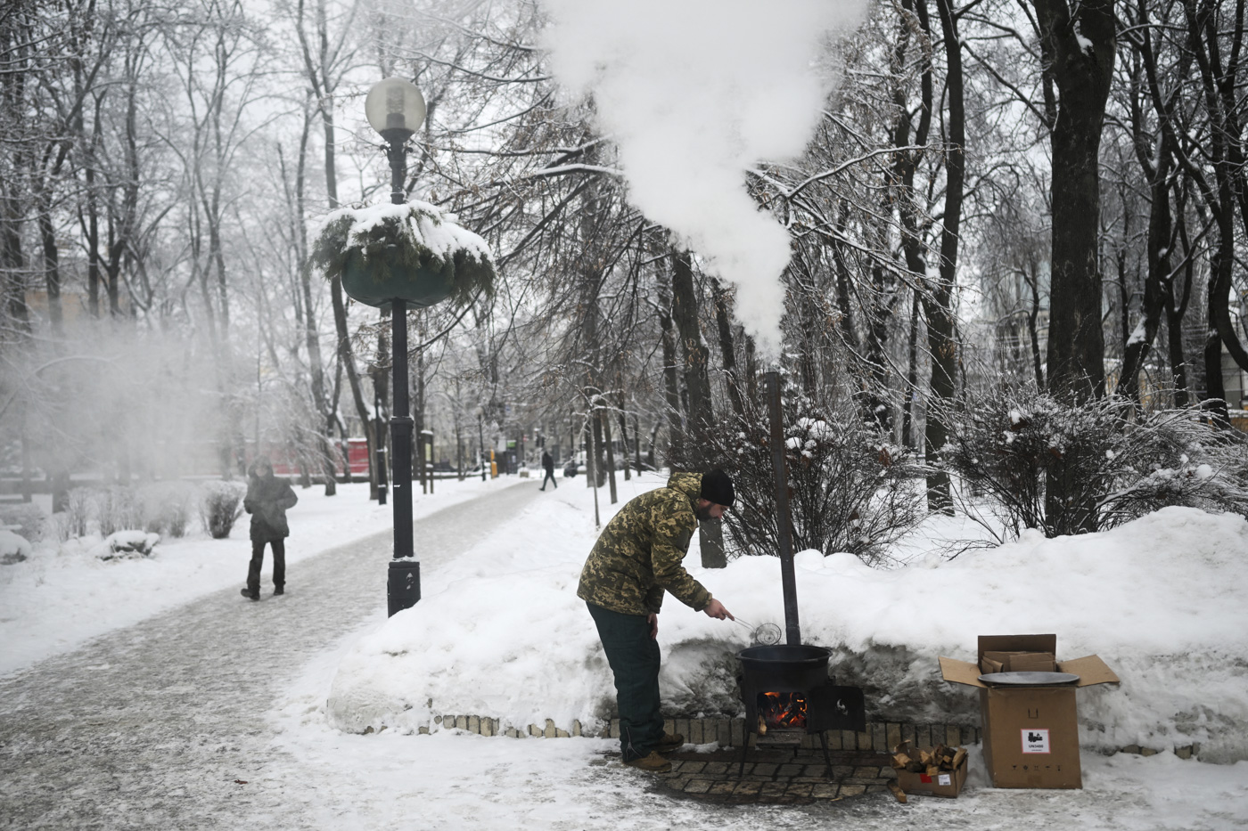 Un voluntario cocina baursak, un pan tradicional de Asia Central, en un punto de calefacción de un parque de Kiev. el 15 de enero de 2026, durante la invasión rusa de Ucrania.
