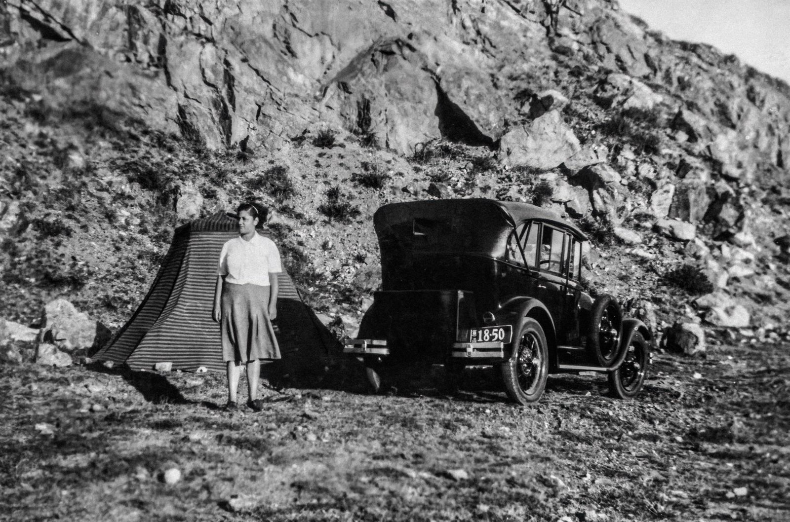 Violeta Fernández junto a la cachila Ford-1927 propiedad de Benito Fernández, acampando cerca del mar en Punta Colorada circa 1945.