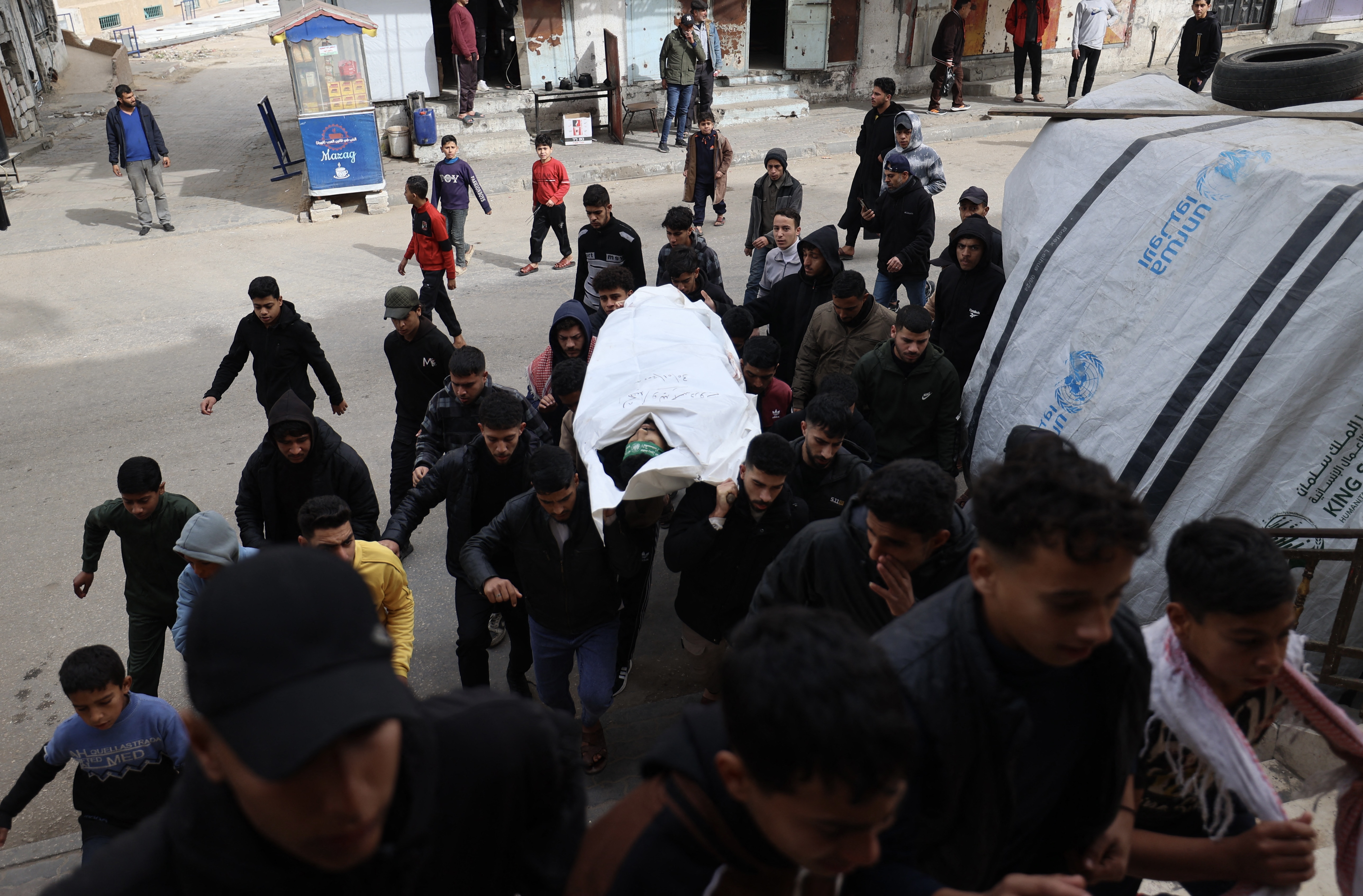 Palestinos desplazados durante un funeral en el campo de refugiados de Maghazi, tras un ataque israelí en el centro de la Franja de Gaza, el 30 de enero.