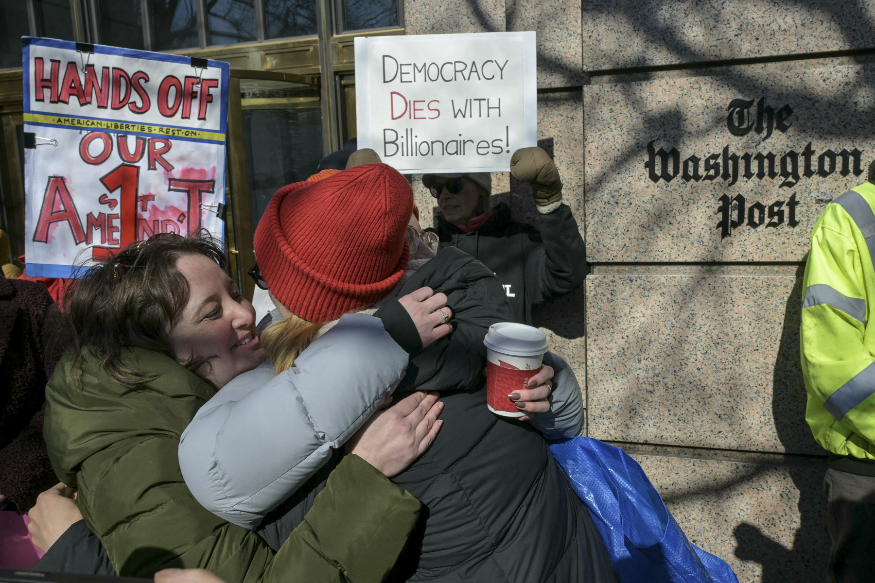 Empleados de _The Washington Post_ junto con simpatizantes del _Washington-Baltimore News Guild_ frente a las oficinas del periódico, en Washington, el 5 de febrero.