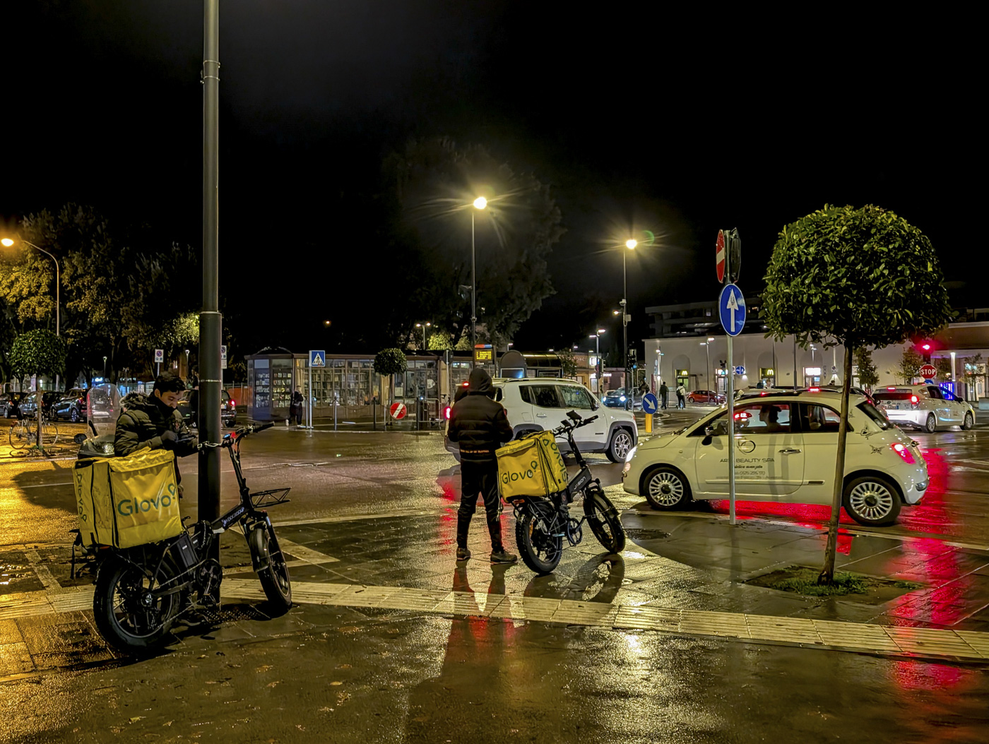 Repartidores de Glovo, cerca de la entrada de la estación de tren de Arezzo, Toscana, Italia (archivo, noviembre de 2025).