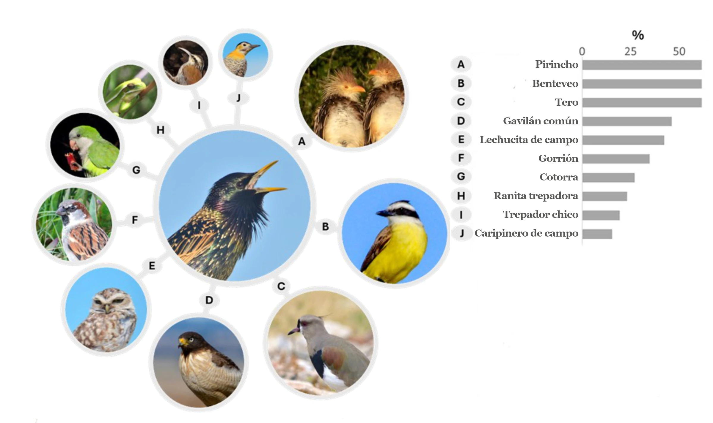 Principales cantos imitados por el estornino en Montevideo. Tomado de Pablo Fenández (Achará, 2025).